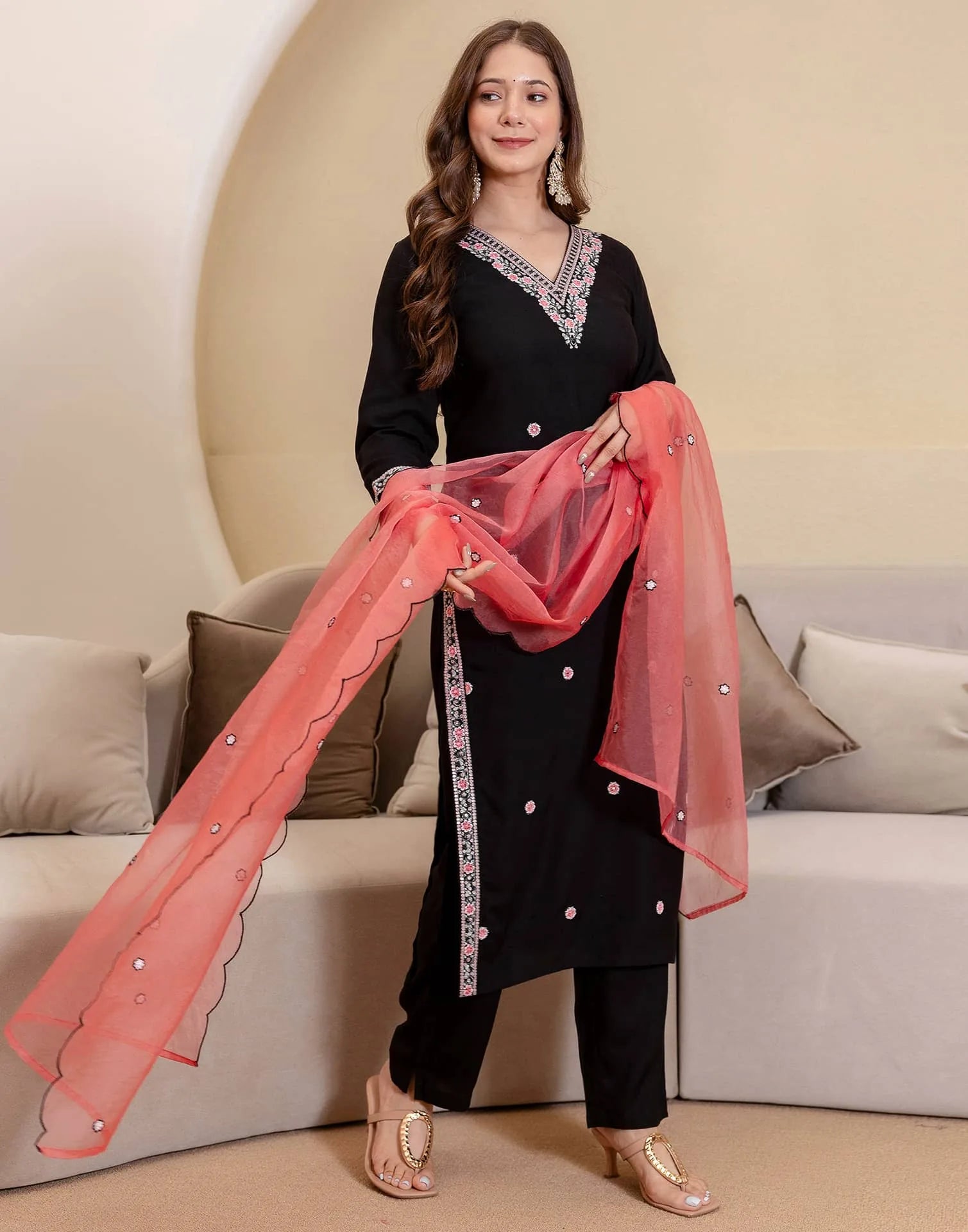 Rayon Embroidered Straight Kurta with Pant & Dupatta