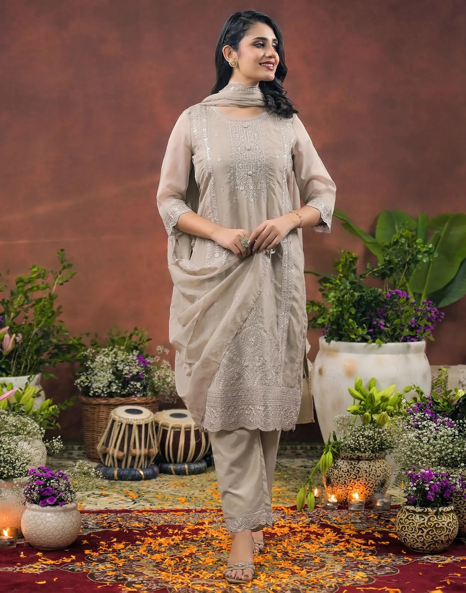 Silk Embroidered Round Neck Straight Kurta with Pant & Dupatta
