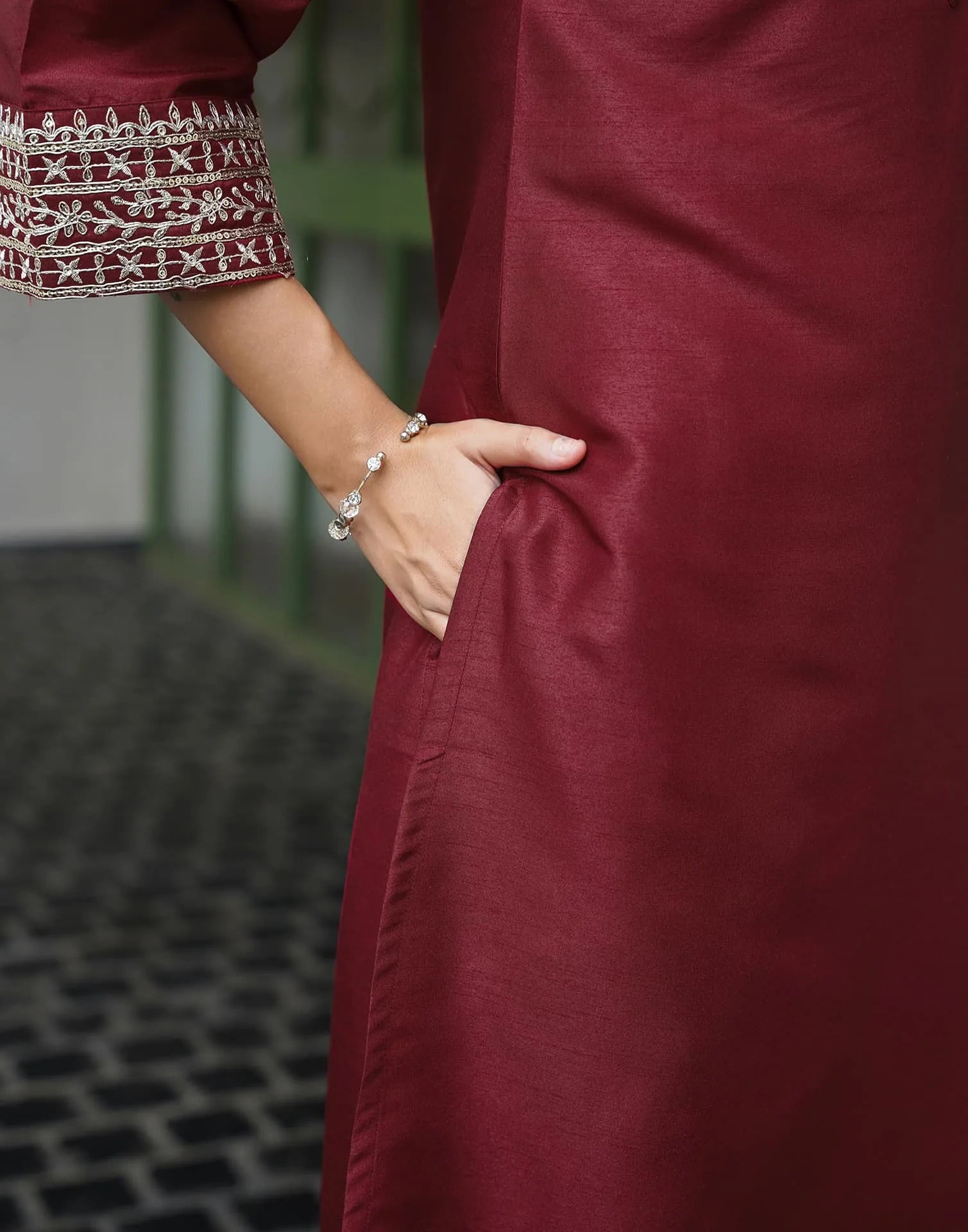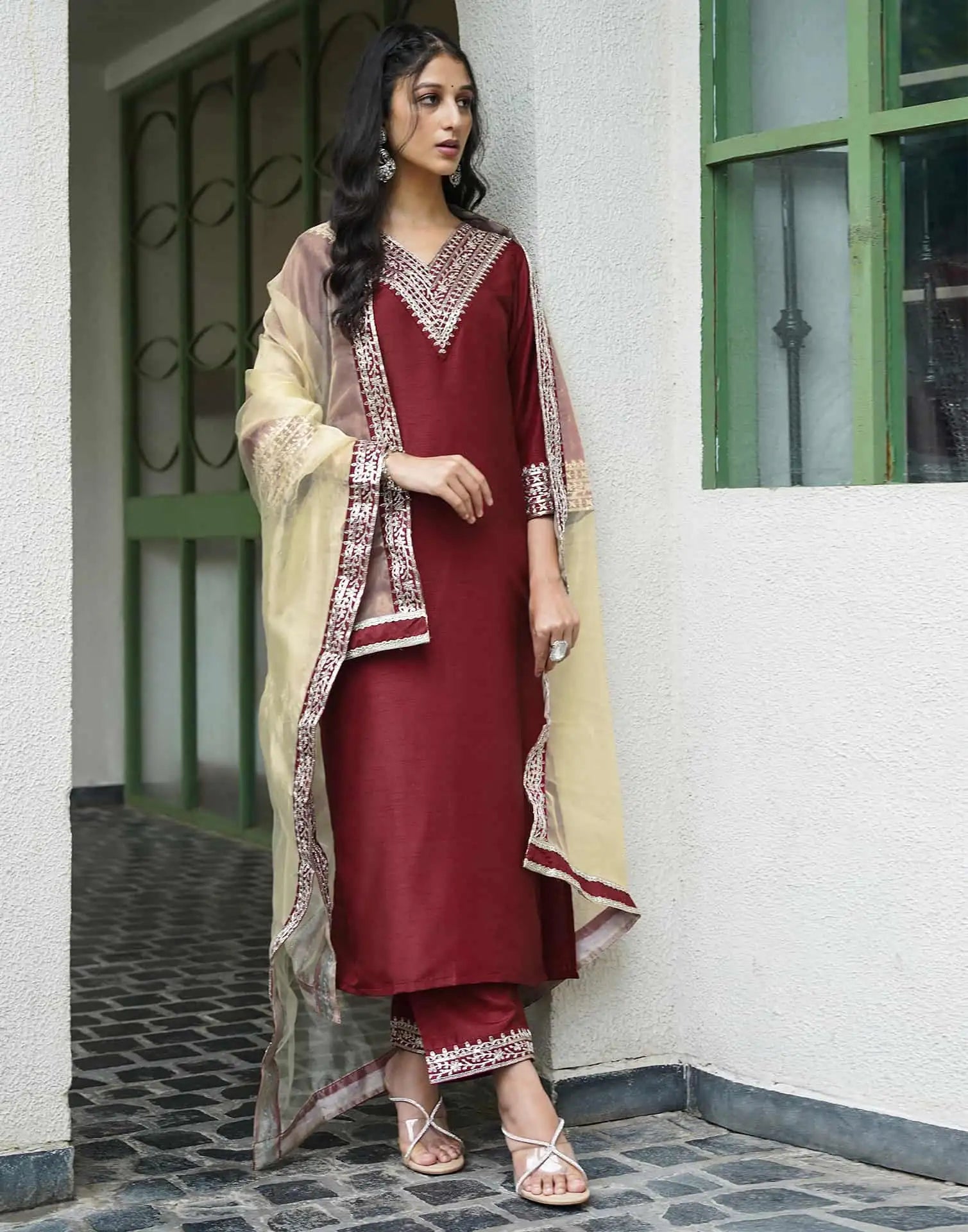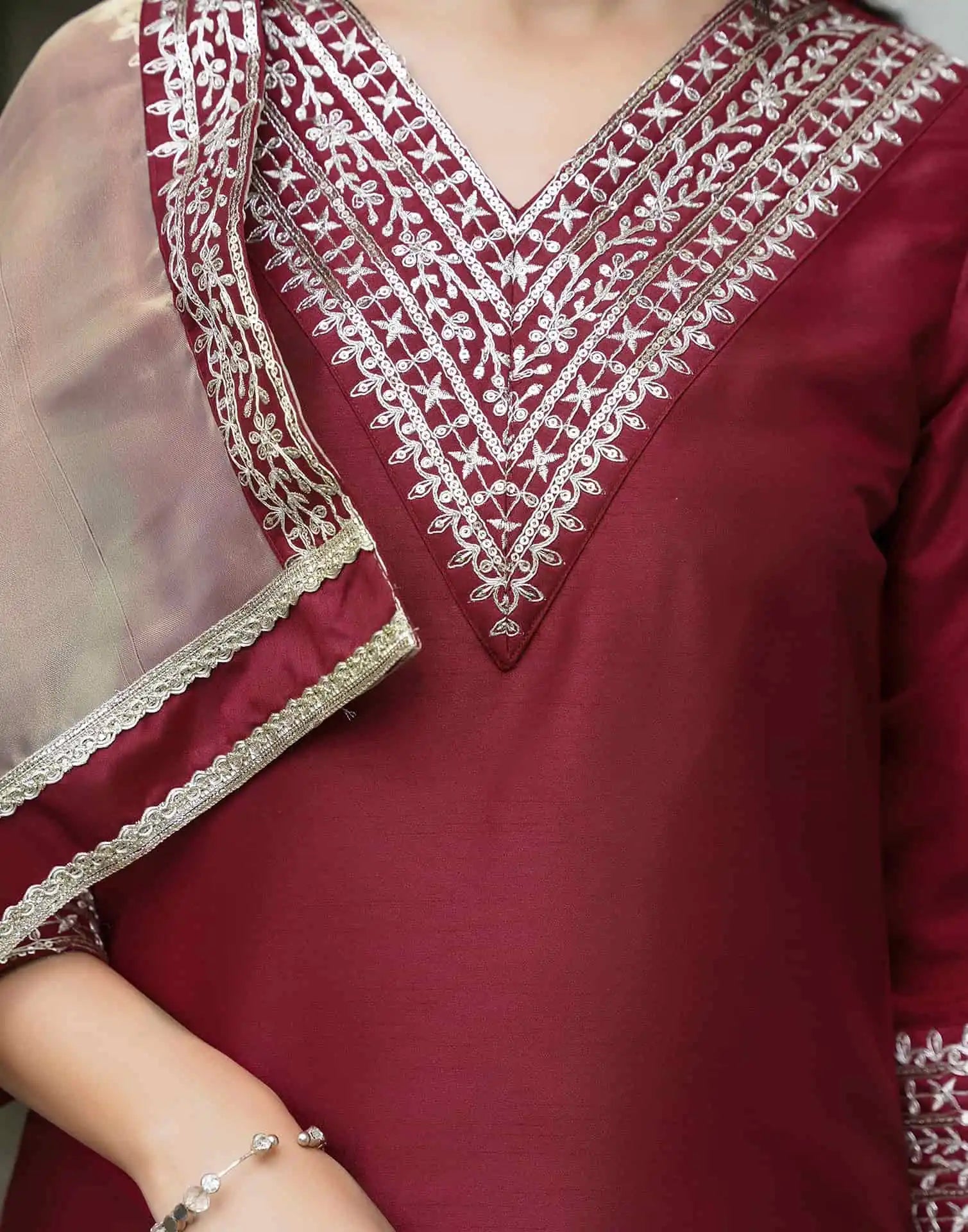 Silk Blend Sequins Embroidery Lace Straight Kurta with Pant & Dupatta