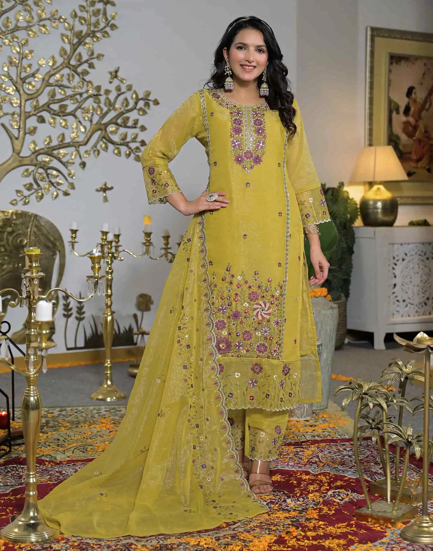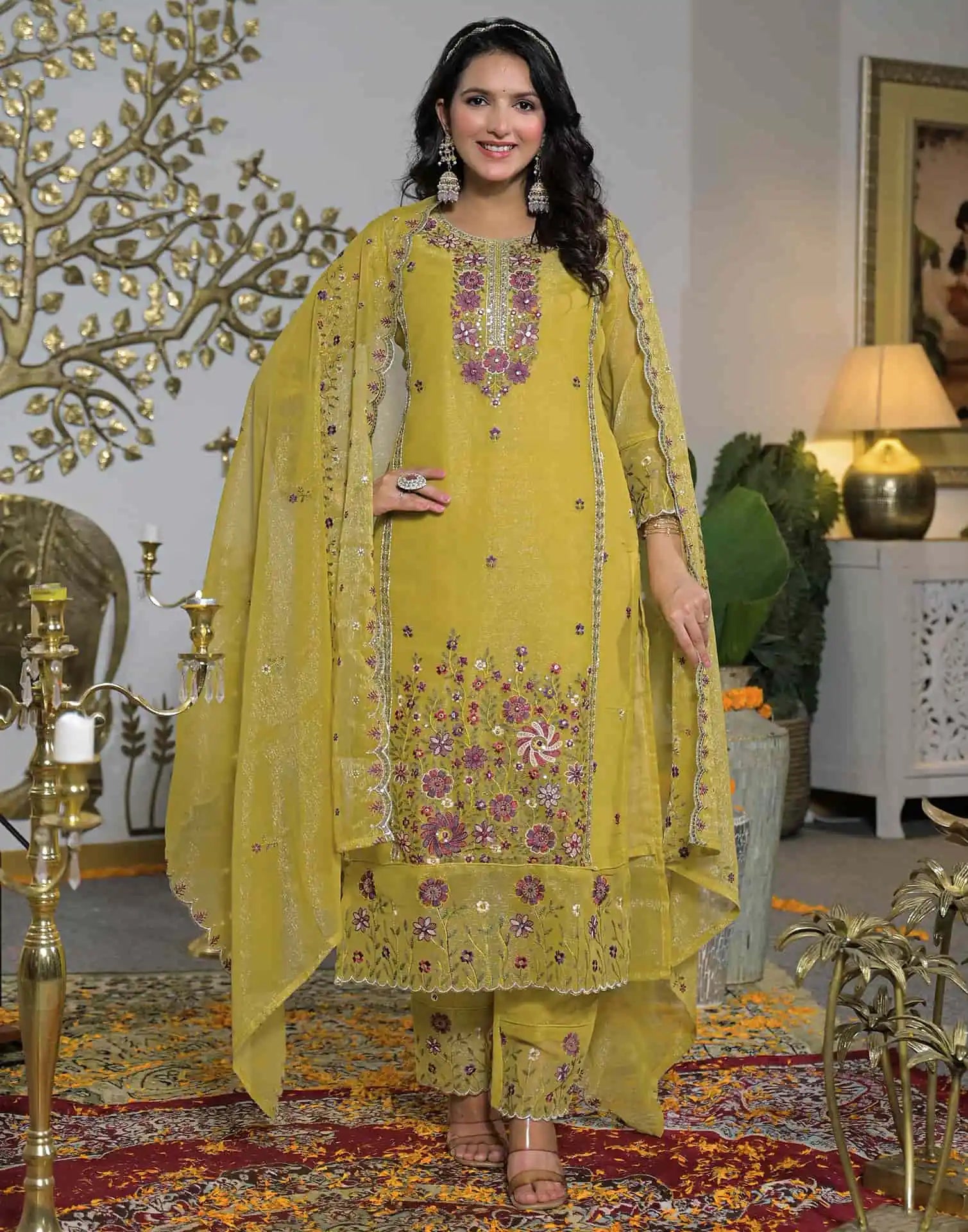 Shimmer Chiffon Straight Embroidery Round Neck Kurta with Pant & Dupatta
