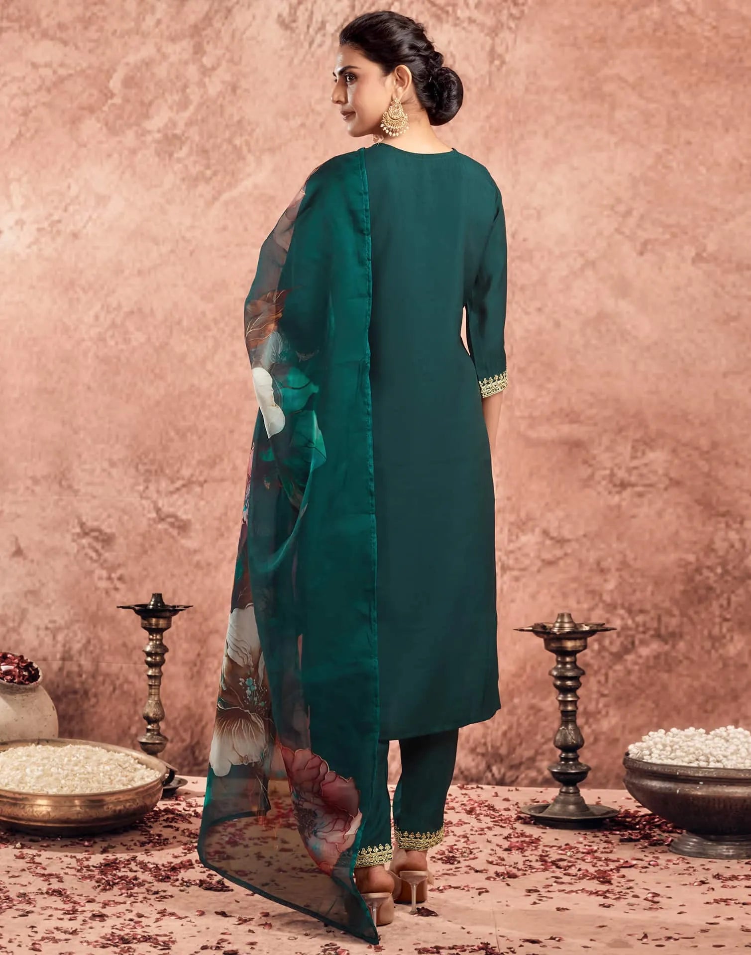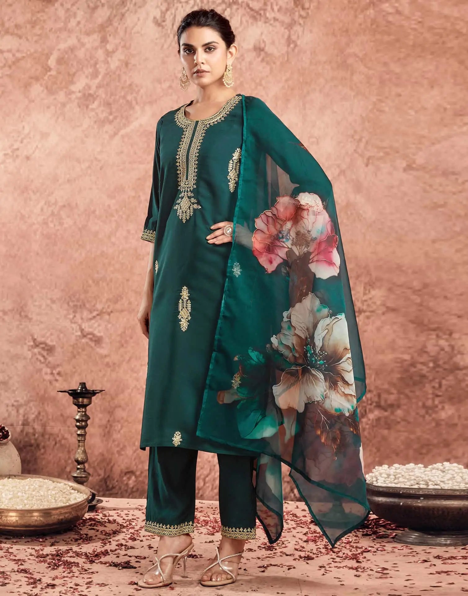 Silk Blend Embroidered Straight Kurta with Pant & Dupatta