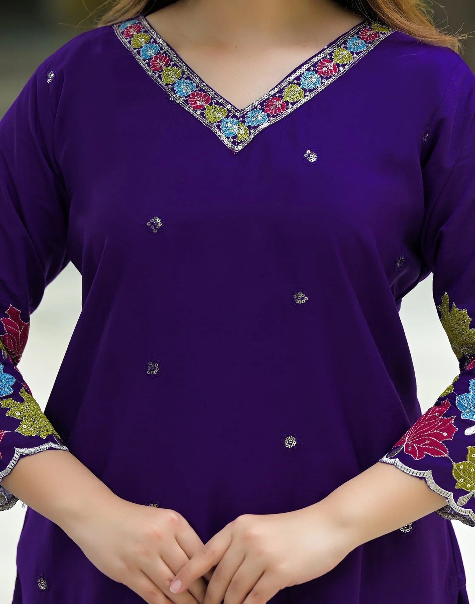 Silk Straight Embroidery V-Neck Kurta with Pant & Dupatta