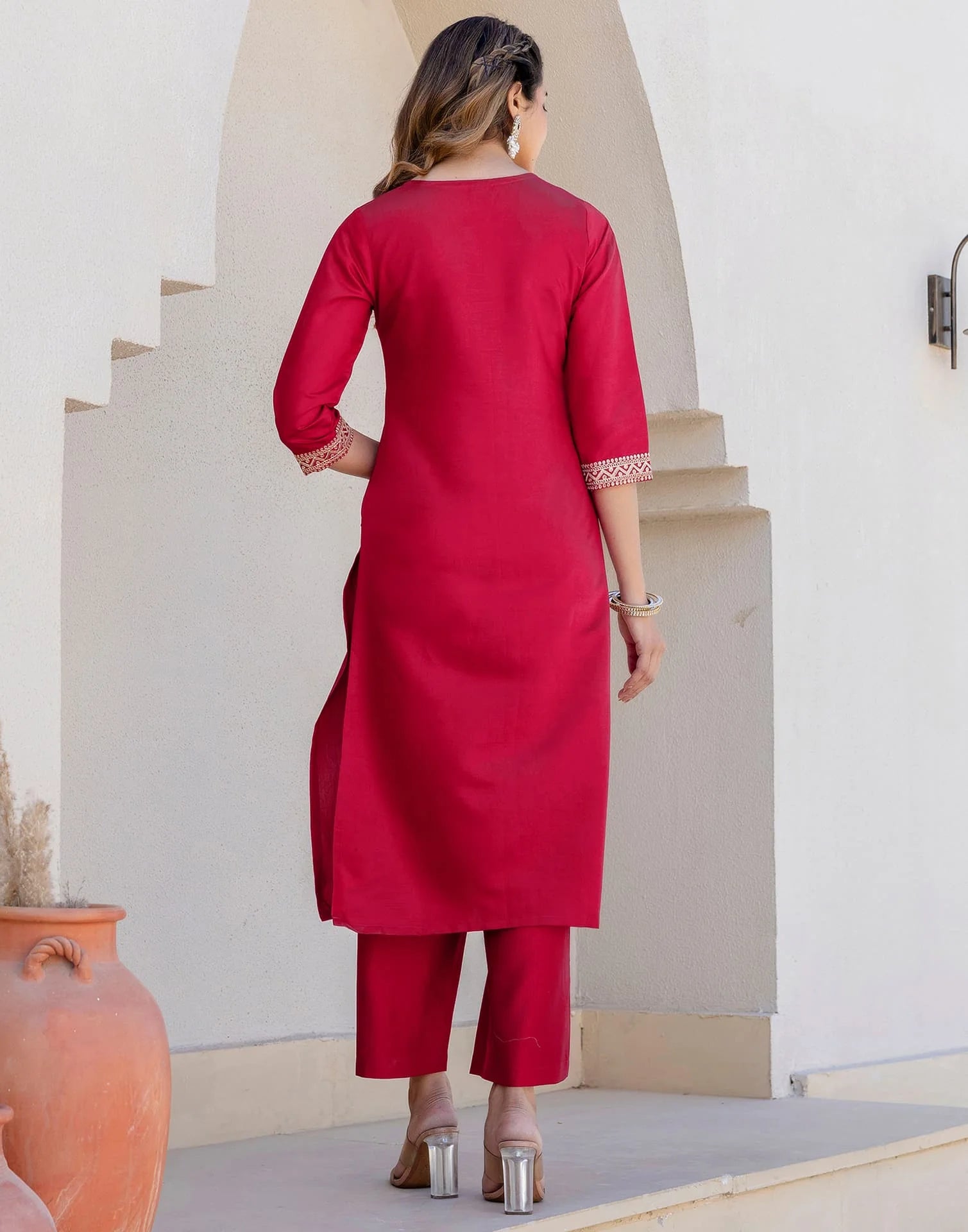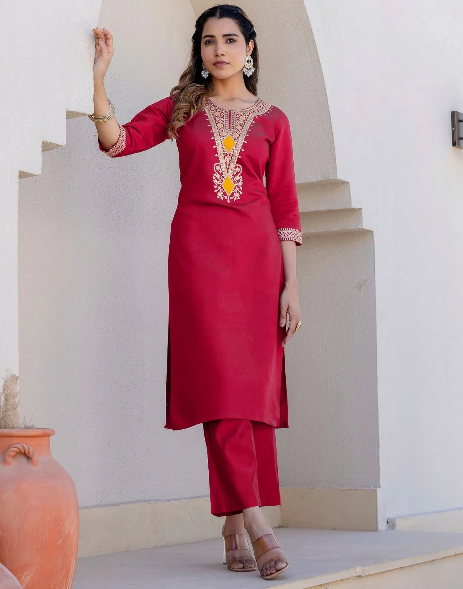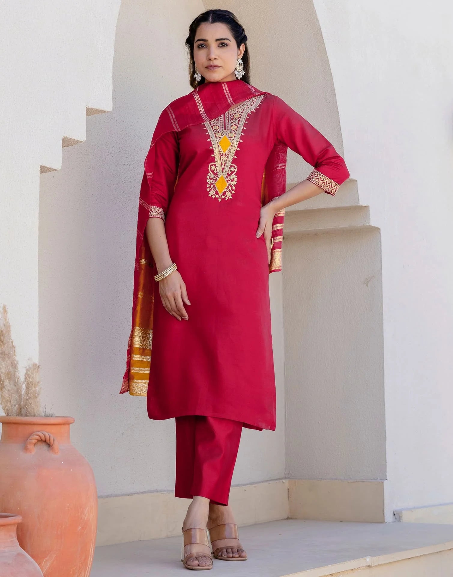 Cotton Blend Embroidery and Sequins Work Straight Kurta with Pant & Dupatta