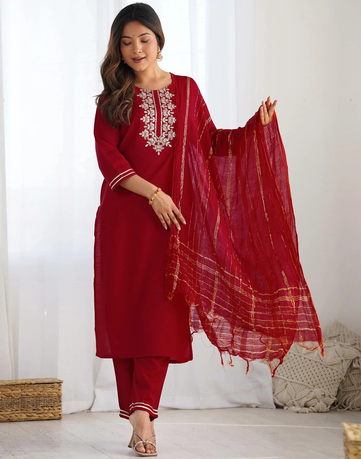 Cotton Blend Sequence, Embroidery and Lace Straight Kurta with Pant & Dupatta