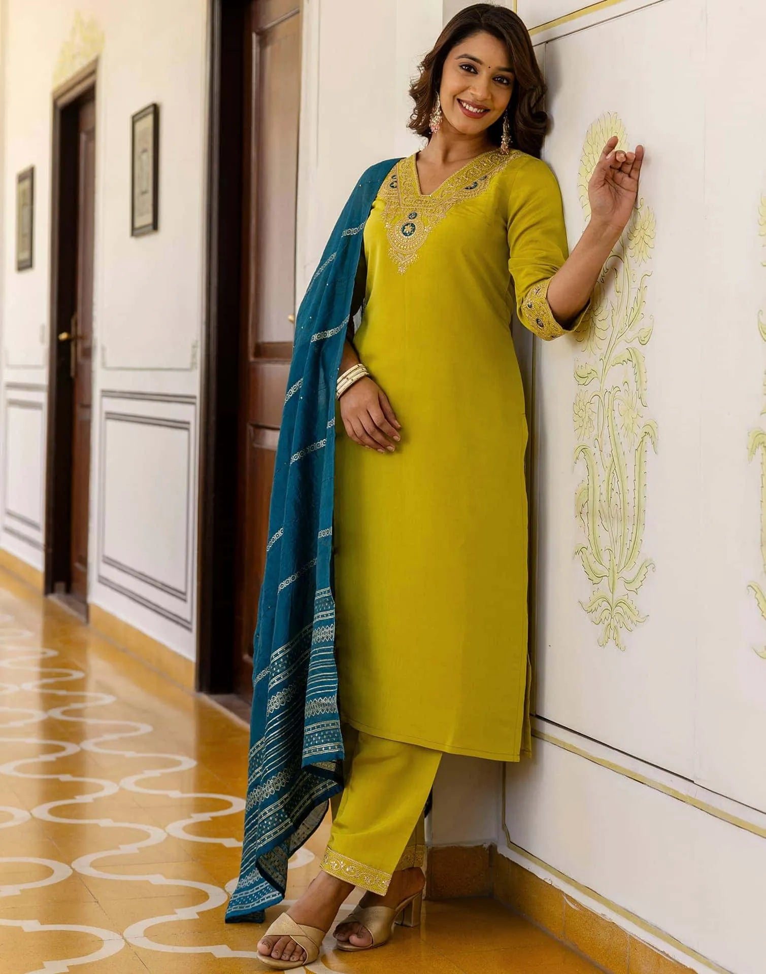 Silk Embroidery and Sequins Work Straight Kurta with Pant & Dupatta