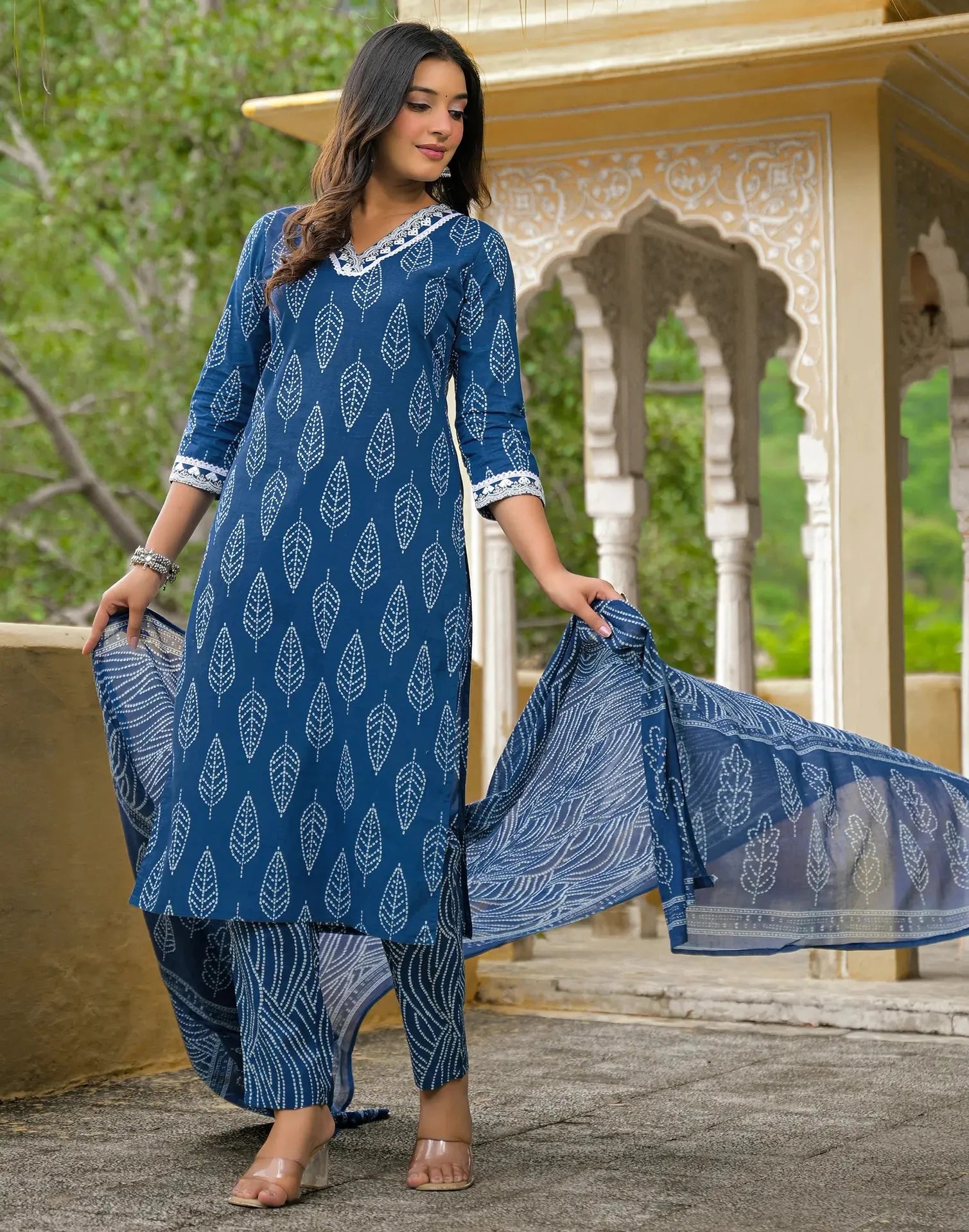 Cotton Printed V-Neck Straight Kurta with Pant & Dupatta