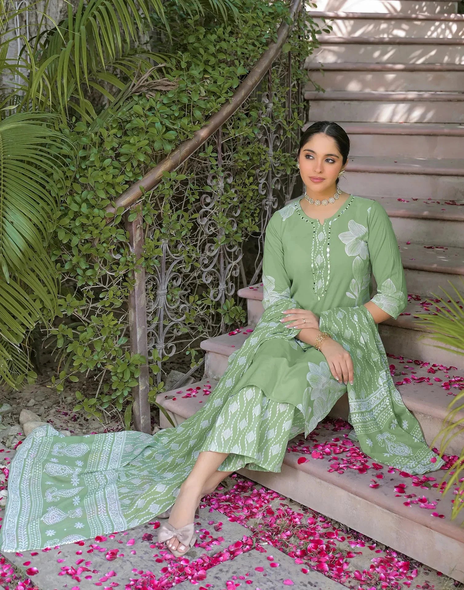 Cotton Printed V-Neck Straight Kurta with Pant & Dupatta