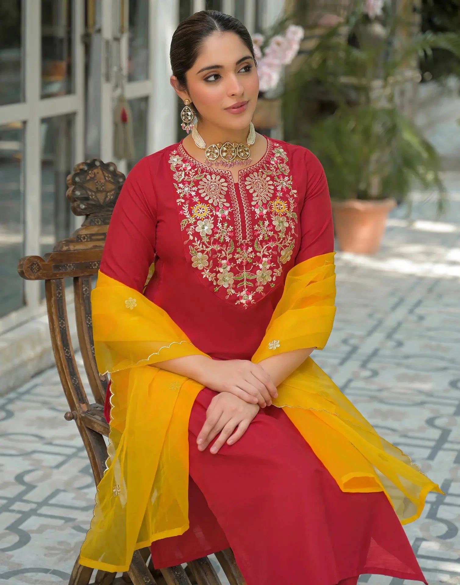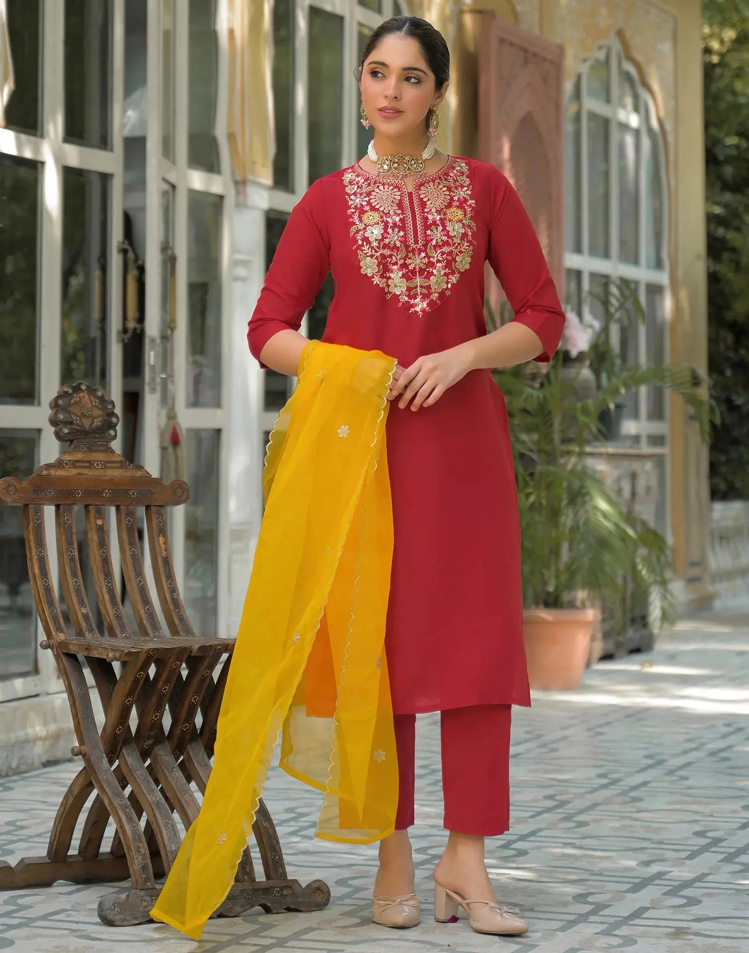Rayon Embroidered Round Neck Straight Kurta with Pant & Dupatta
