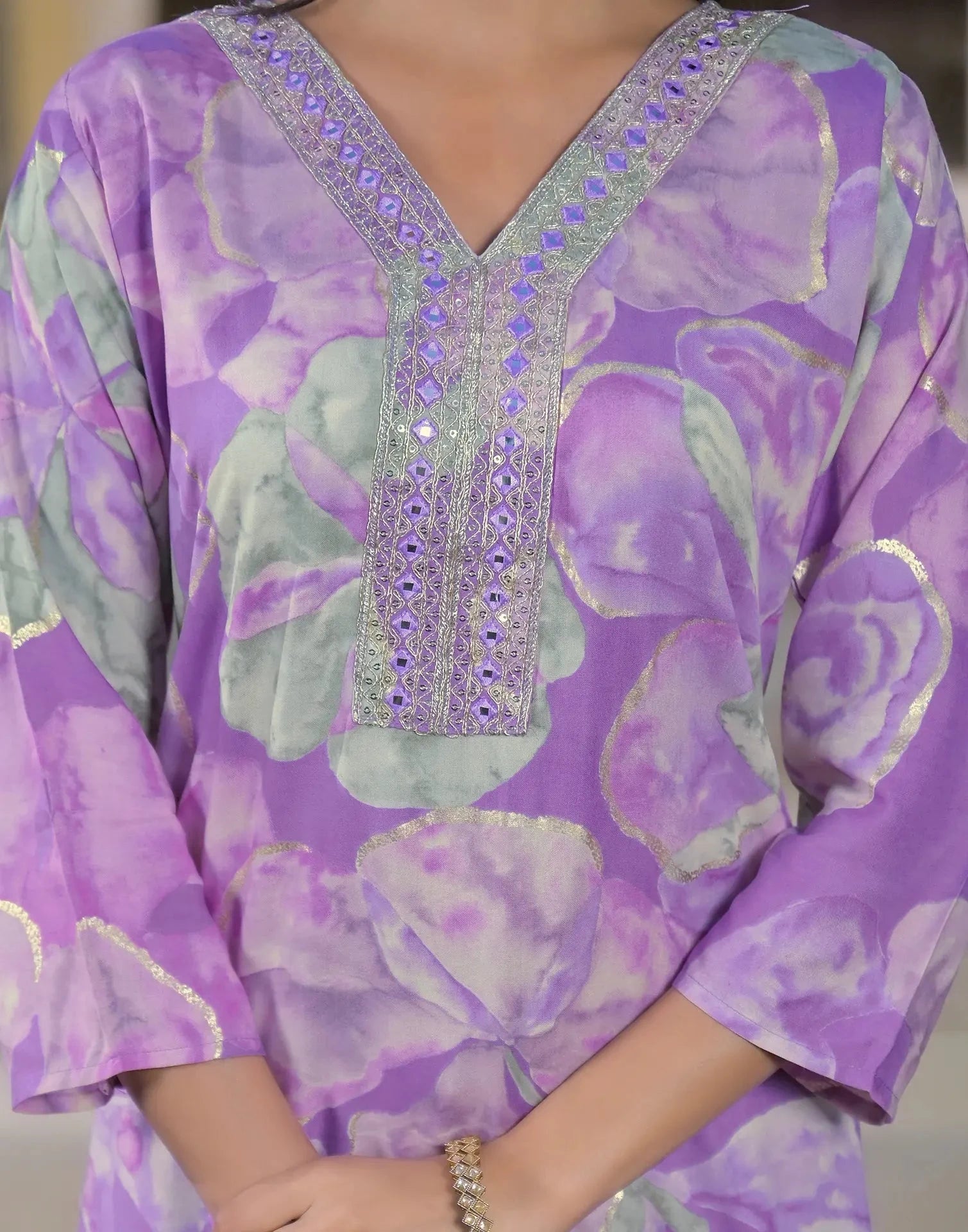 Rayon Printed V-Neck Straight Kurta with Pant & Dupatta