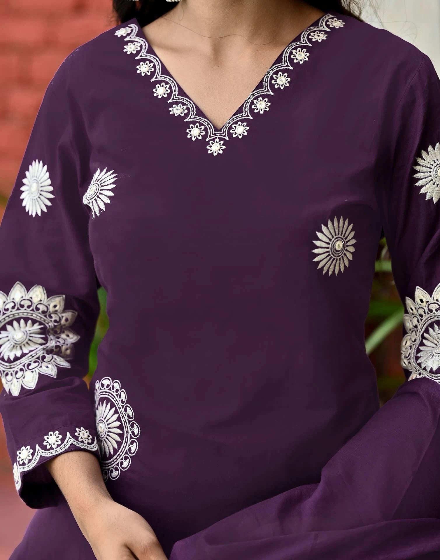 Cotton Straight Embroidery V-Neck Kurta with Pant & Dupatta