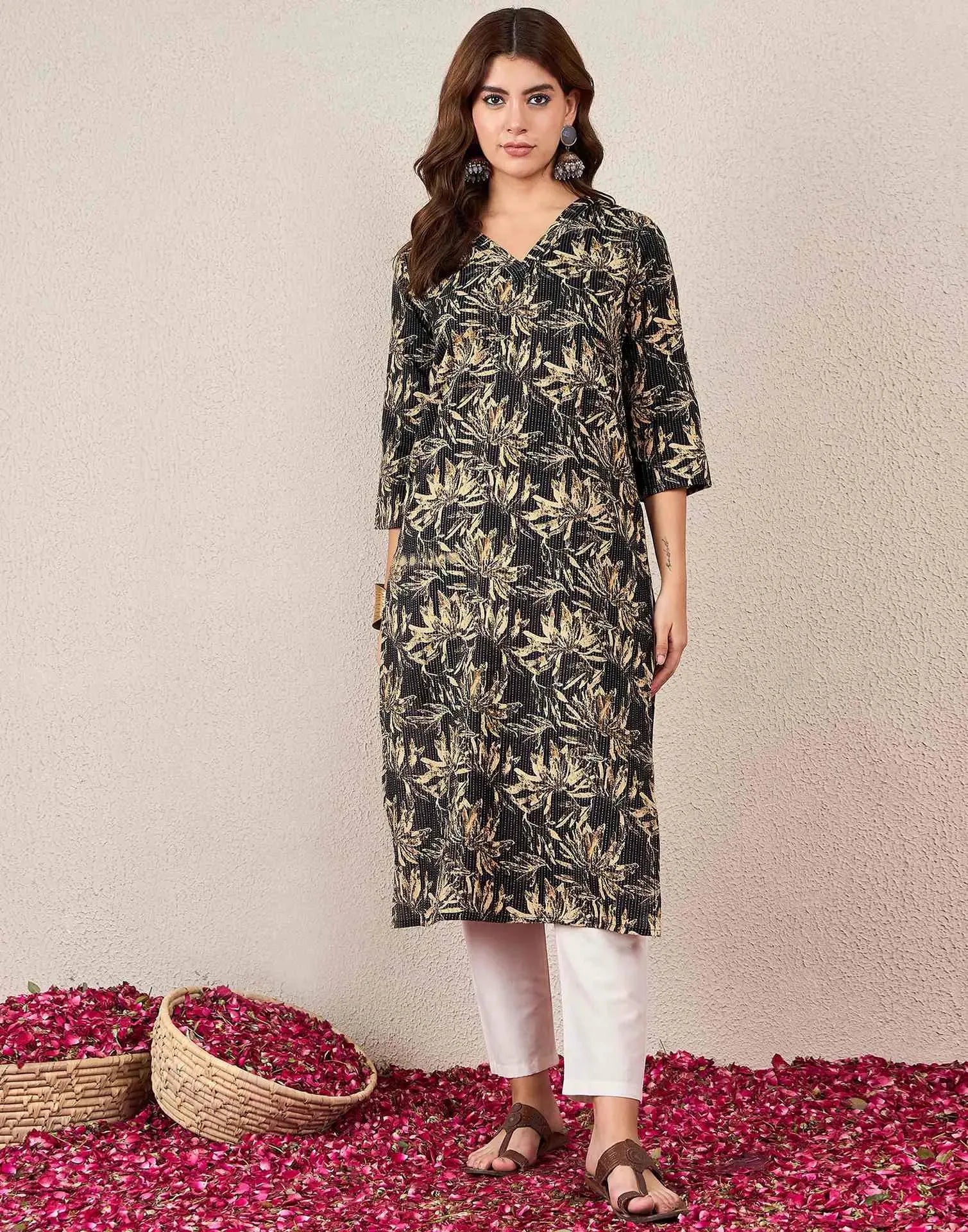 Cotton Embroidered Straight V-Neck Kurti