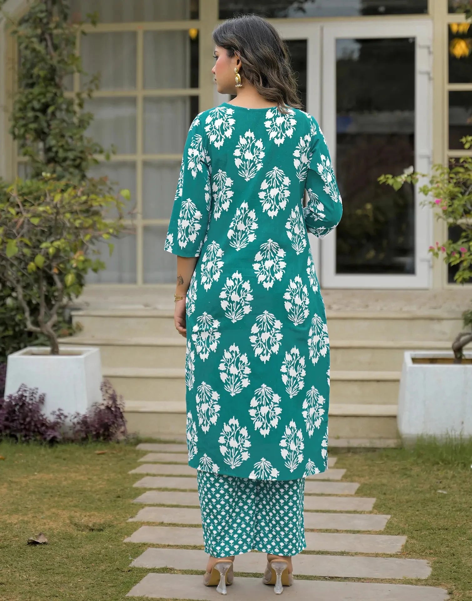 Cotton Embroidered V-Neck Straight Kurta with Pant & Dupatta