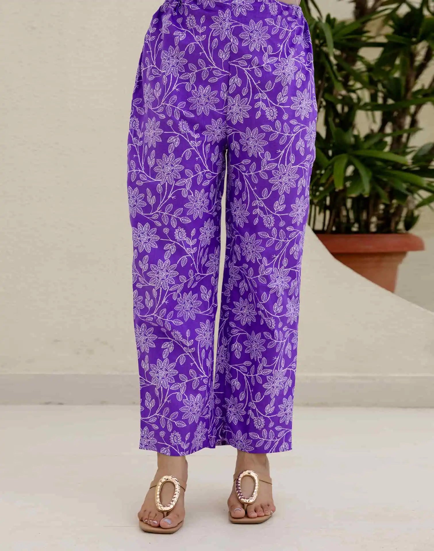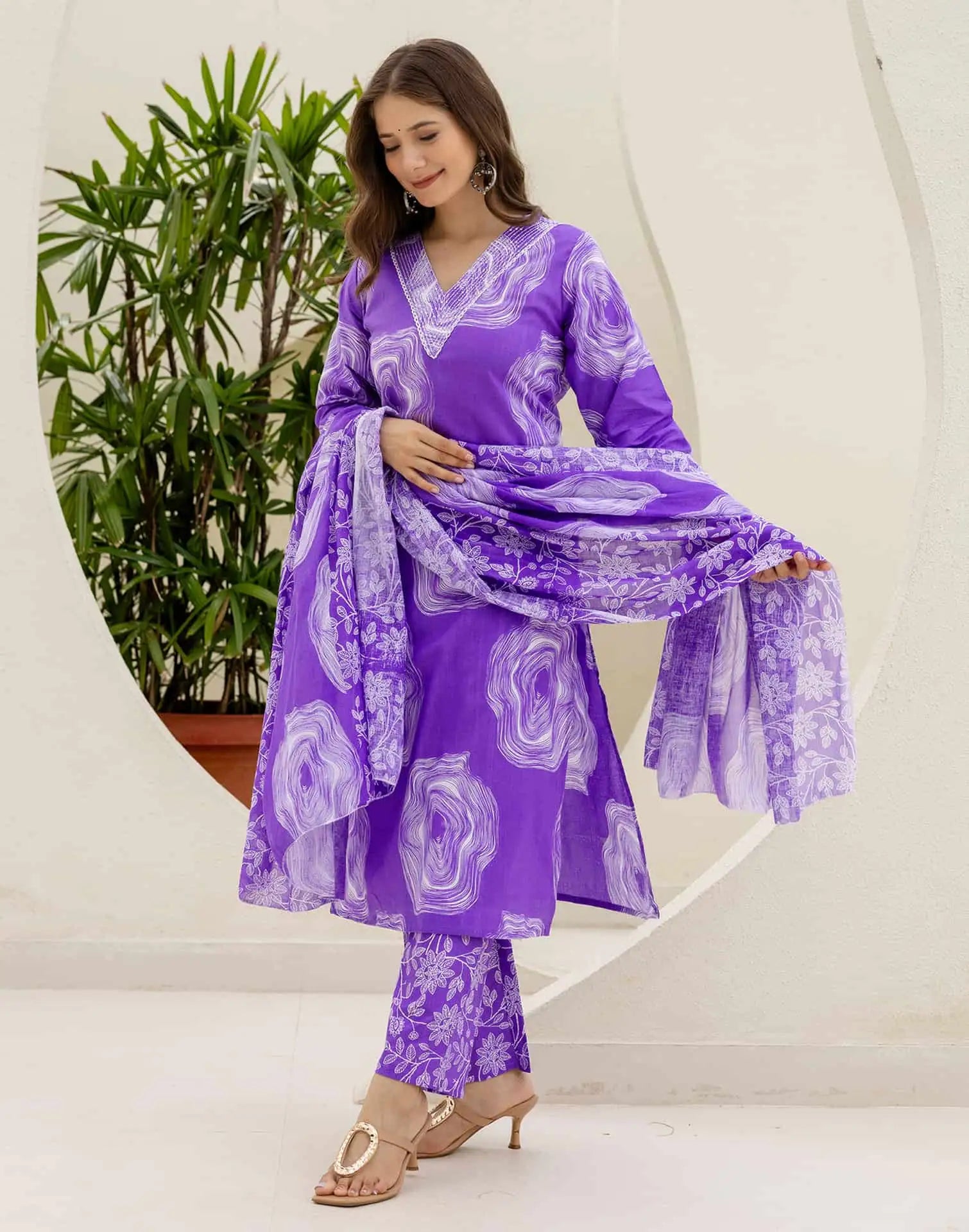 Cotton Straight Printed V-Neck Kurta with Pant & Dupatta