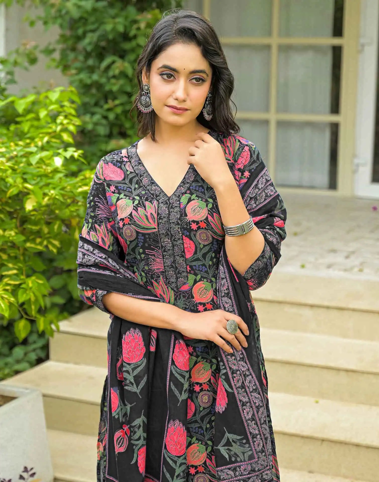 Cotton Straight Printed V-Neck Kurta with Pant & Dupatta