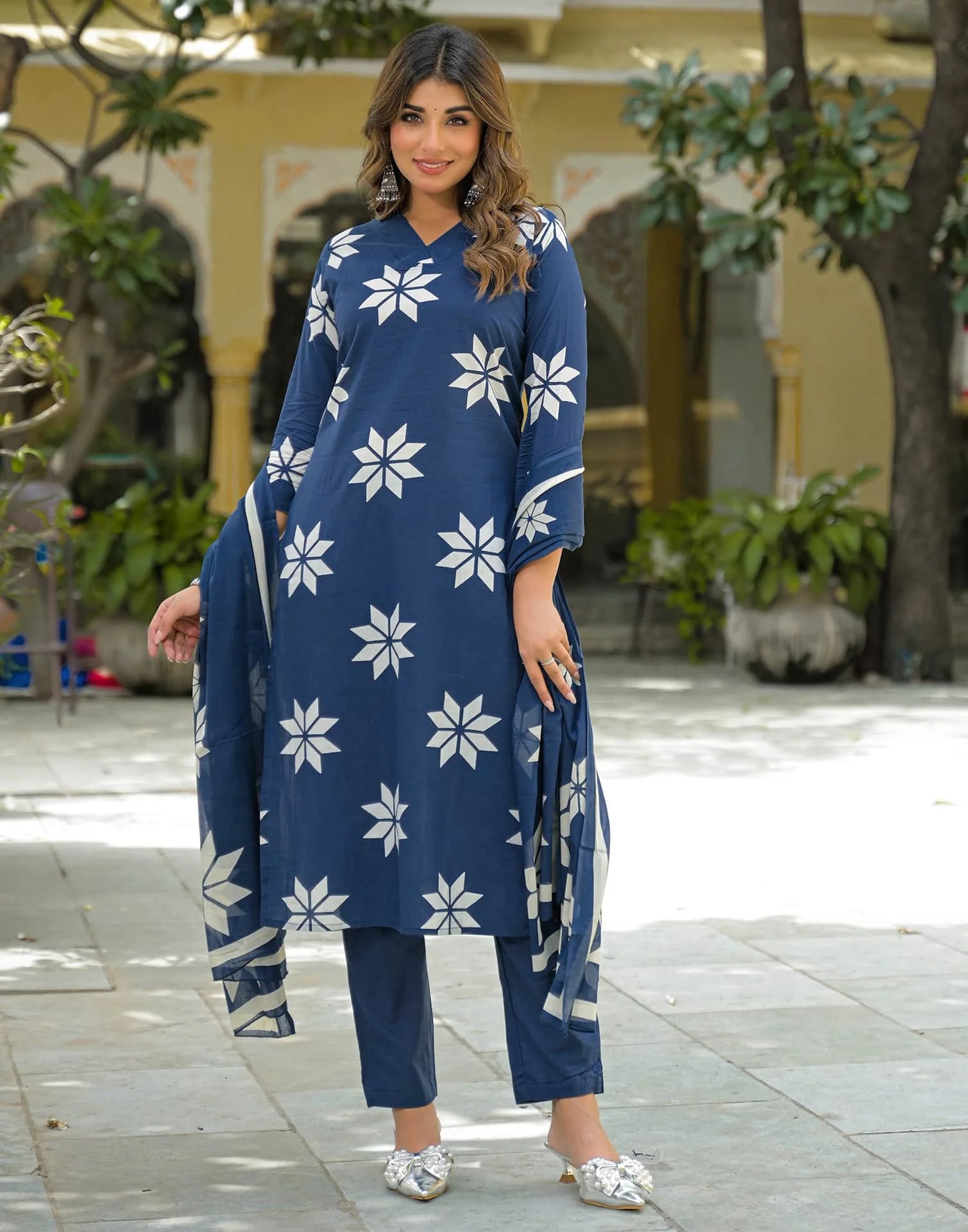 Cotton Straight Printed V-Neck Kurta with Pant & Dupatta