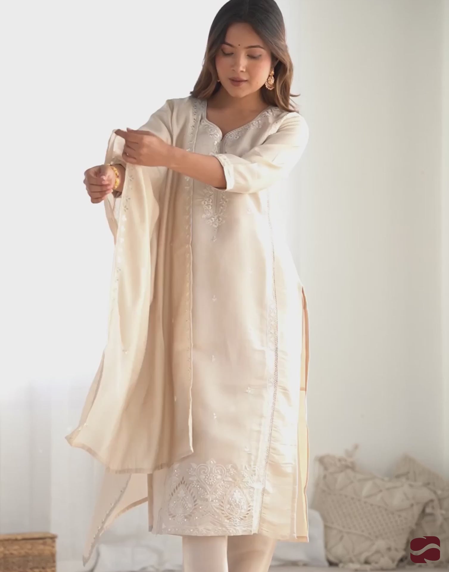Beige Silk Sequence Sweetheart Neck 3/4 Sleeve Straight Kurta Set With Pant & Dupatta
