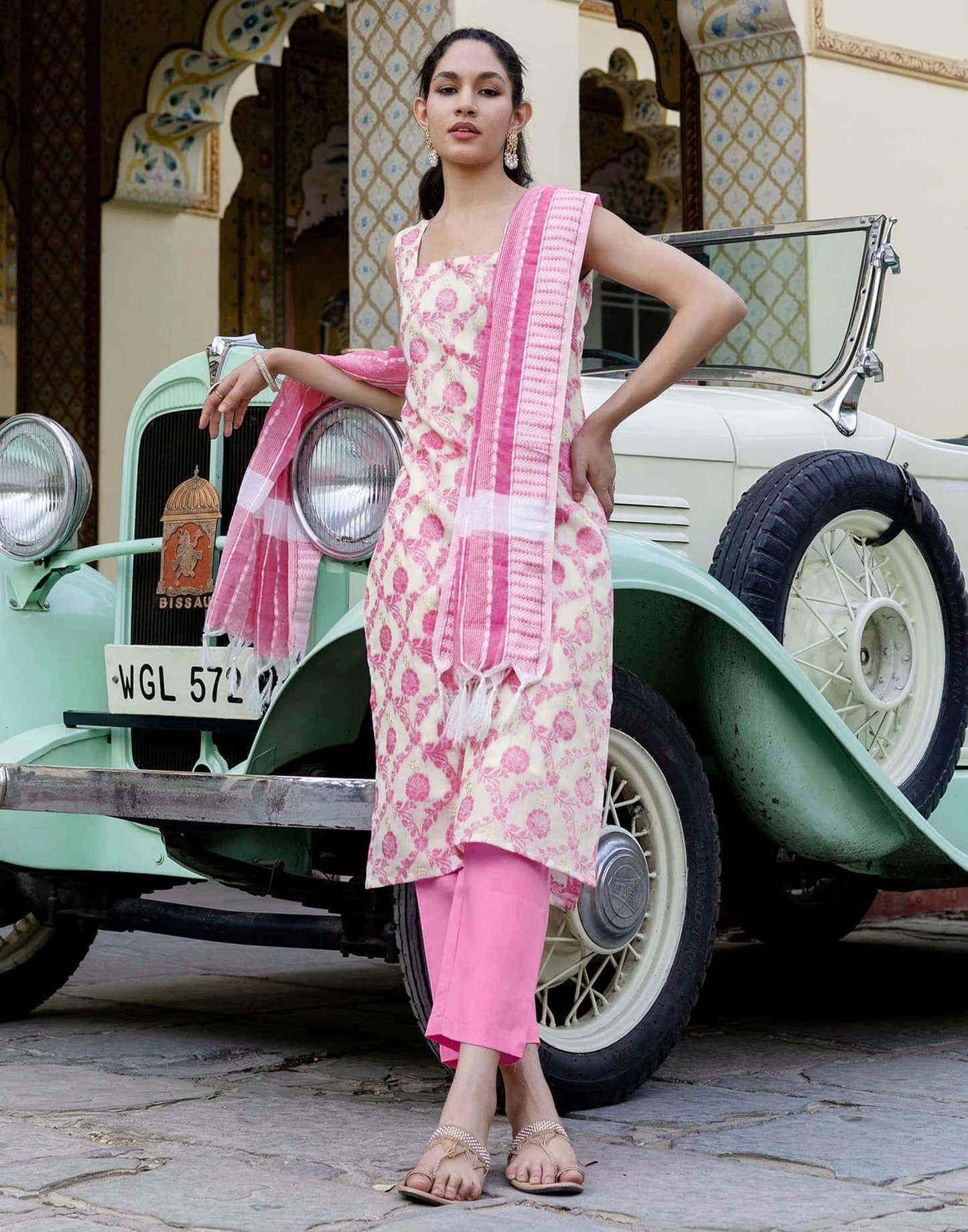 Bring elegance to every occasion with this Cream Chanderi kurta set. Featuring Weaving on the kurta and a Square Neck, it radiates traditional charm. Styled with Pant With Pocket and dupatta, this outfit is ideal for Festive Wear. Its lightweight fabric ensures breathability and comfortable wear, while the dupatta adds a touch of grace. Lightweight Fabric, Comfortable Wear, Ethnic Wear for Women.