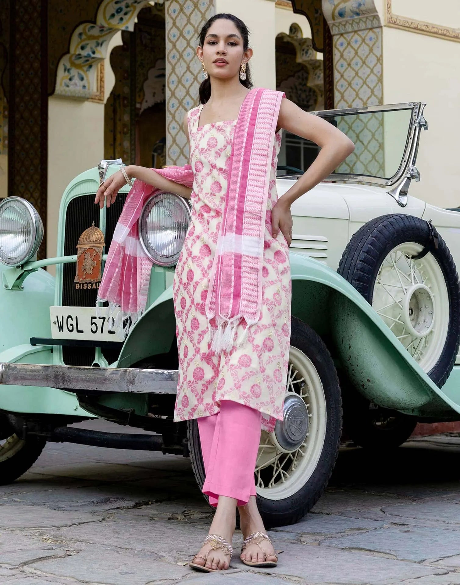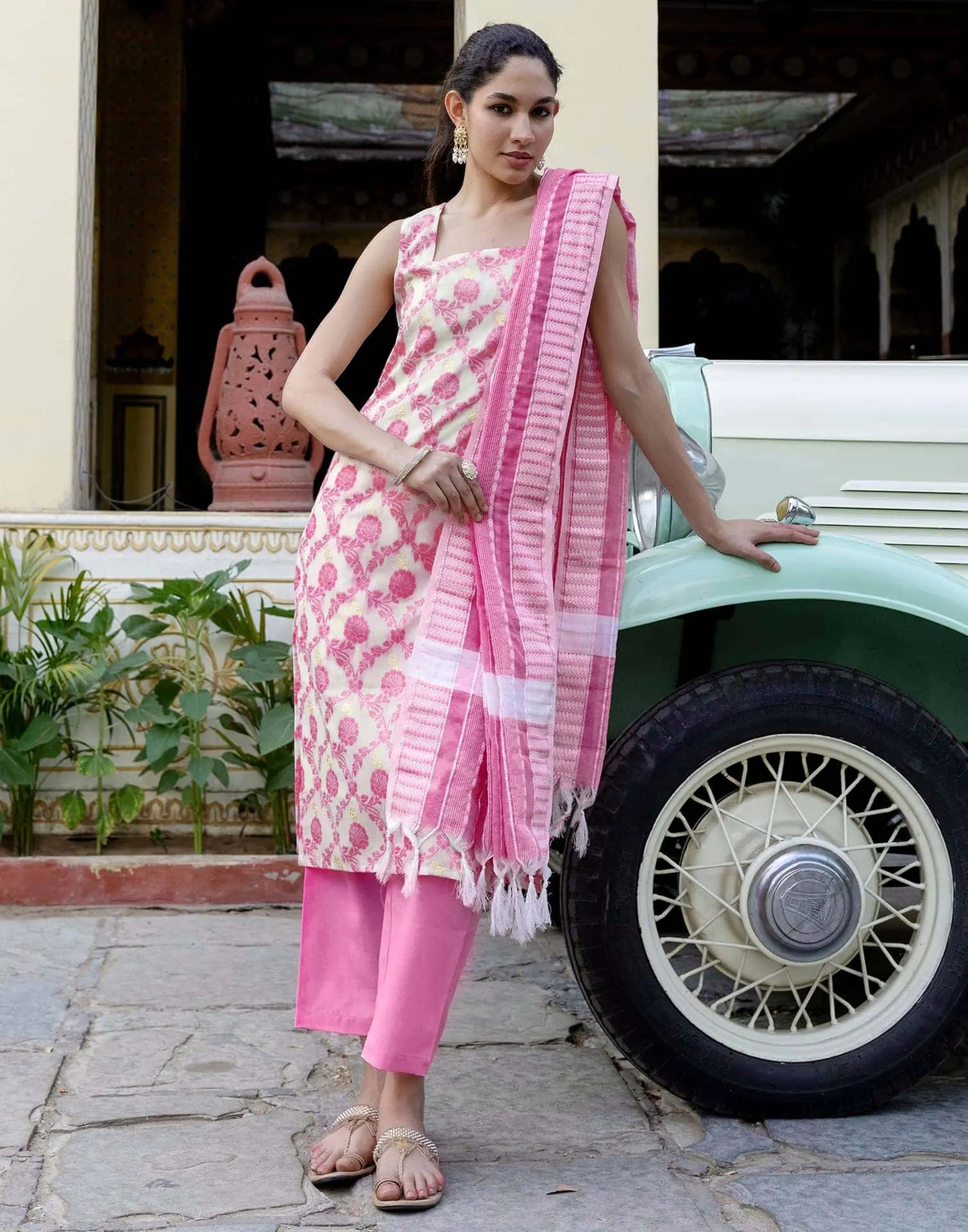 Chanderi Weaving Straight Kurta with Pant & Dupatta