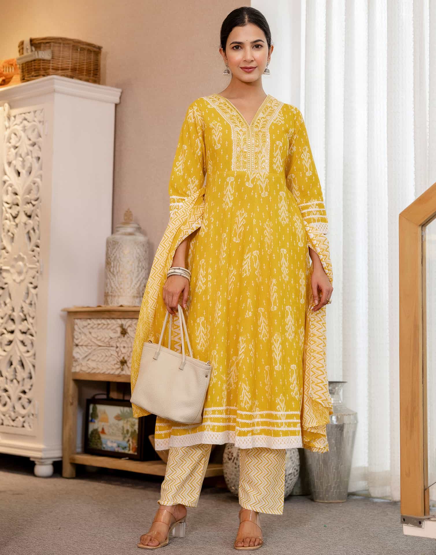 Cotton Anarkali Printed V-Neck Kurta with Pant & Dupatta