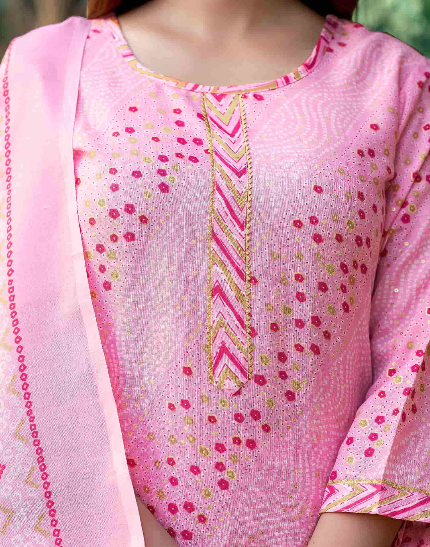 Cotton Blend Badhani Printed, Foil Printed and Gota Lace Straight Kurta with Pant & Dupatta