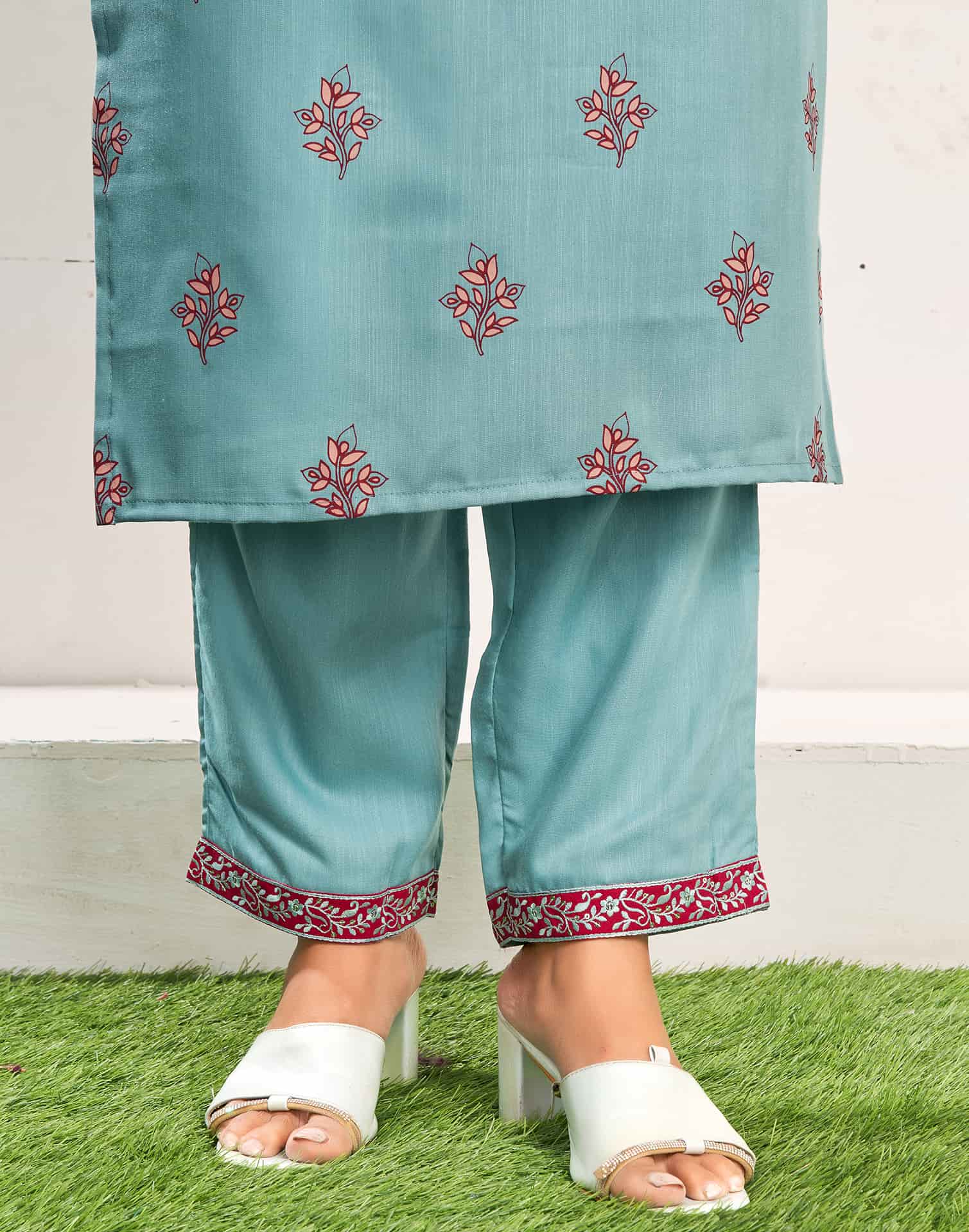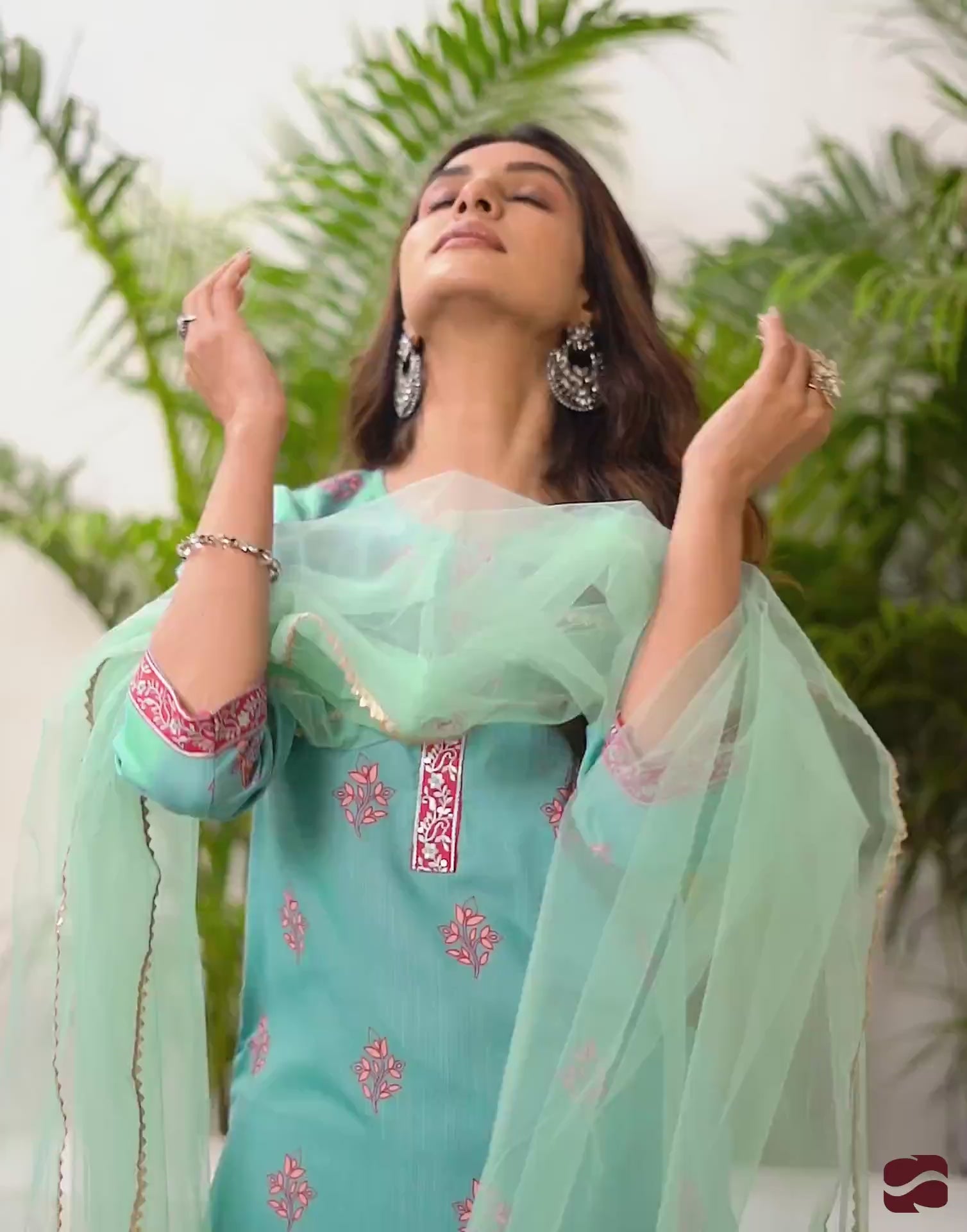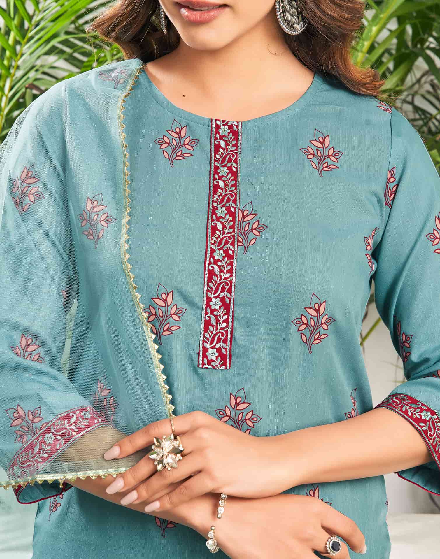 Cotton Blend Embroidered Straight Kurta with Pant & Dupatta