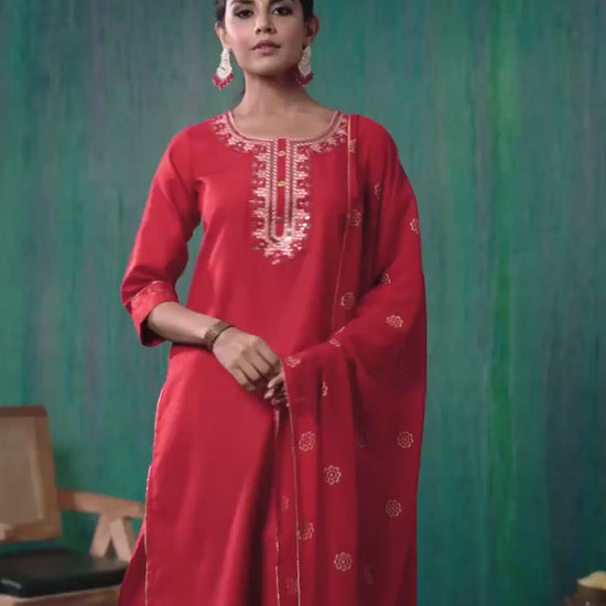 Refresh your ethnic collection with this Cotton Blend kurta set in Red. Highlighted by Embroidered and styled with a Round Neck, the kurta blends comfort with tradition. Teamed with Pant and dupatta, this outfit is perfect for Festive Wear. It guarantees comfortable wear, premium fabric, and the ease of an everyday ethnic wear. All-day Comfort, Lightweight Fabric, Ethnic Wear for Women.