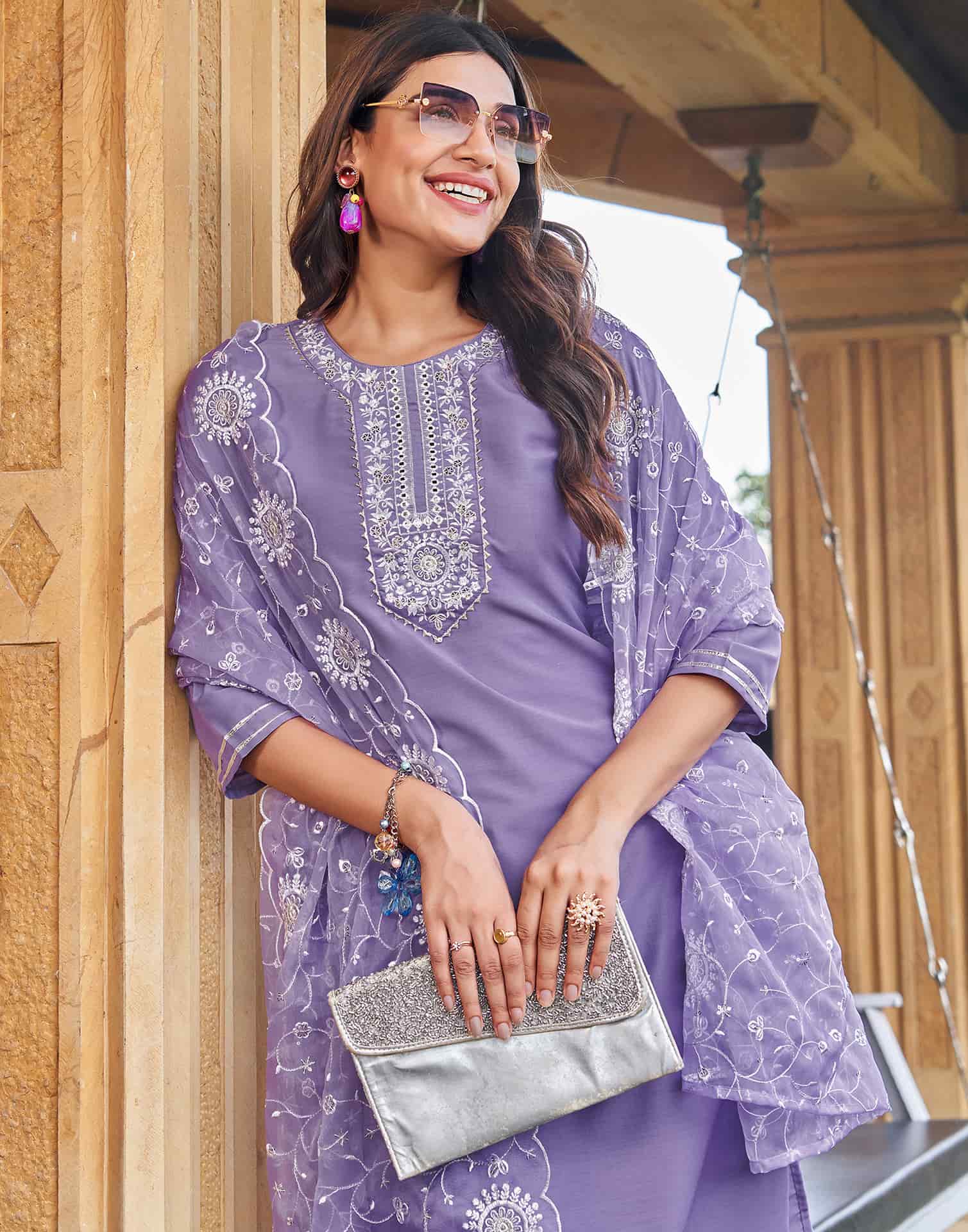 Experience the beauty of tradition with this Purple Cotton Blend kurta set. Adorned with Embroidered and styled with a Round Neck, the kurta exudes sophistication. Complemented with Pant and an elegant dupatta, this complete outfit is ideal for Festive Wear. Crafted in India with premium fabric, it ensures all-day comfort and effortless elegance. Lightweight Fabric, Made in India, Soft & Breathable Fabric.