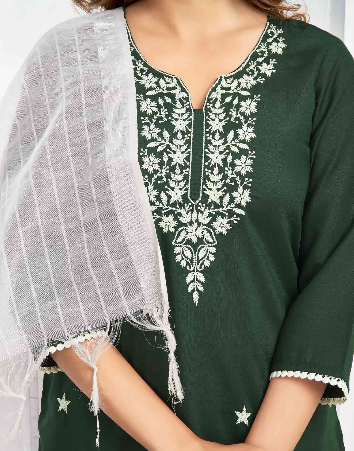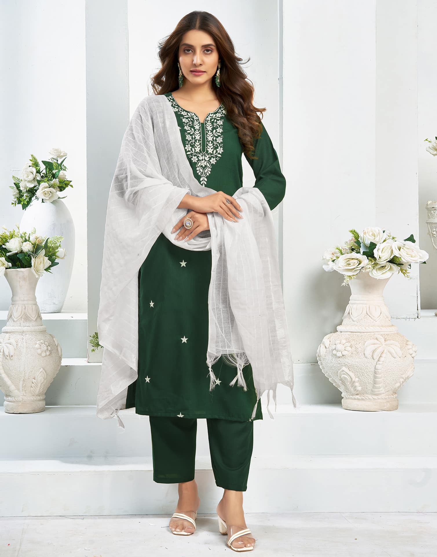 Refresh your ethnic collection with this Cotton Blend kurta set in Green. Highlighted by Embroidered and styled with a Sweetheart Neck, the kurta blends comfort with tradition. Teamed with Pant and dupatta, this outfit is perfect for Festive Wear. It guarantees comfortable wear, lightweight fabric, and the ease of an everyday ethnic wear. Kurta with Pant & Dupatta, Premium Fabric, Family Function Wear.