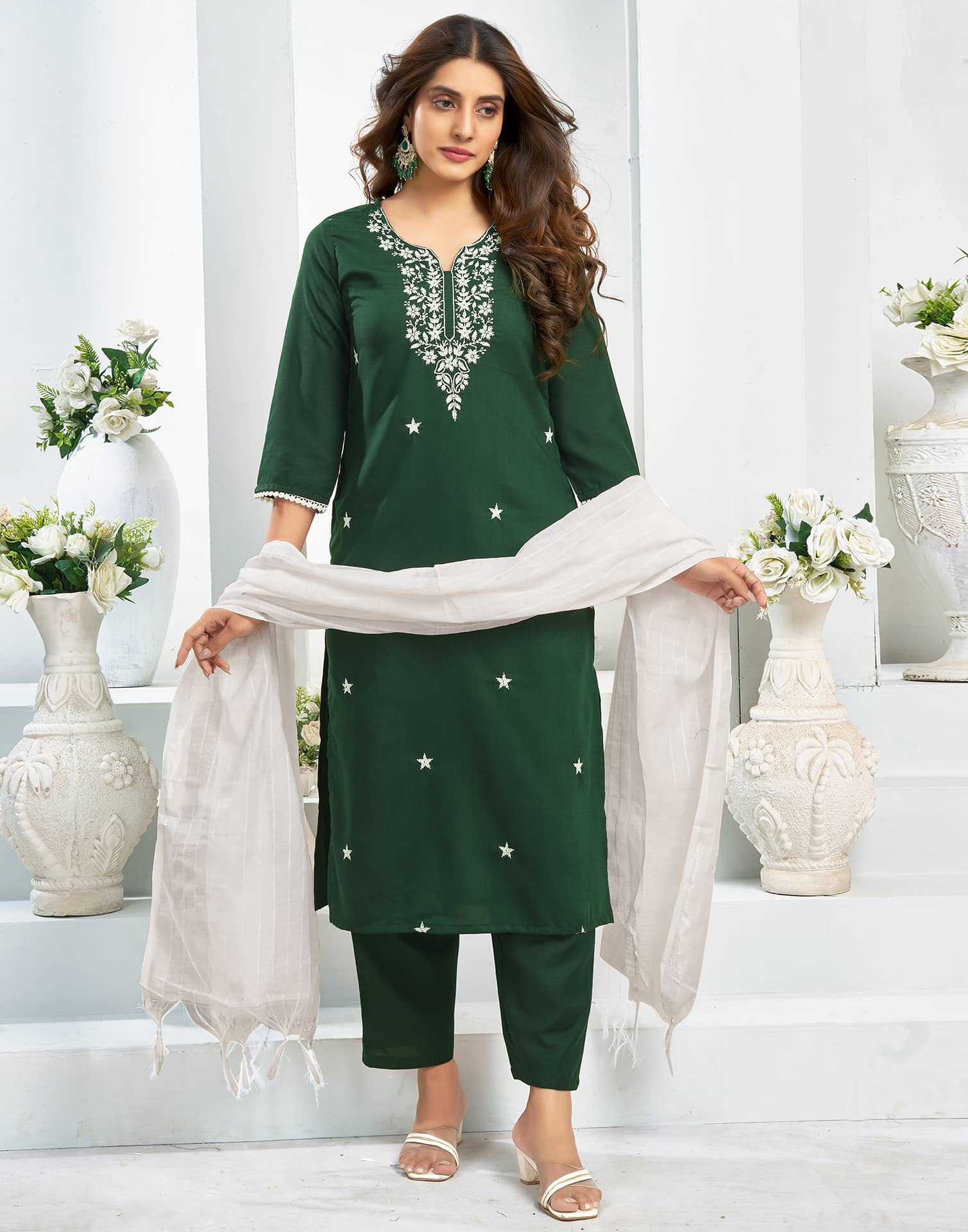 Cotton Blend Embroidered Straight Kurta with Pant & Dupatta