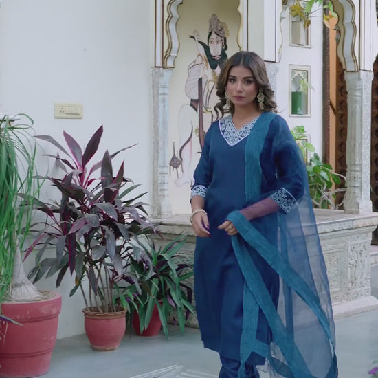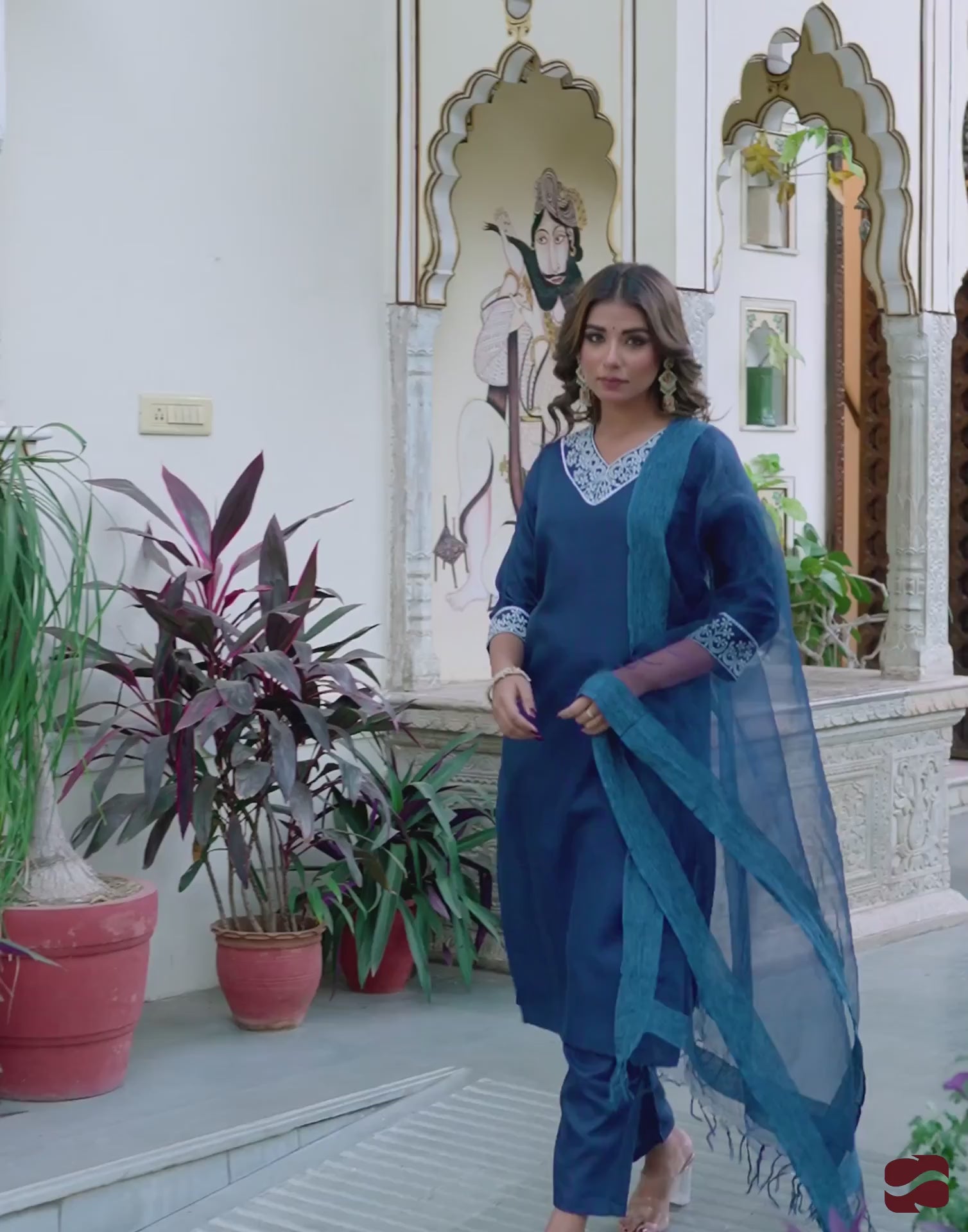 This Blue Cotton Blend kurta set is beautifully designed with Embroidered. The kurta features a V-Neck and a graceful silhouette for an elegant appeal. It is paired with Pant and a matching dupatta, making it a complete kurta set. Perfect for Festive Wear, this ethnic wear for women offers premium fabric, ease of movement, and timeless charm. Elegant Dupatta, Ethnic Wear for Women, Family Function Wear.