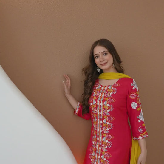 Cotton Blend Embroidered Straight Kurta with Pant & Dupatta
