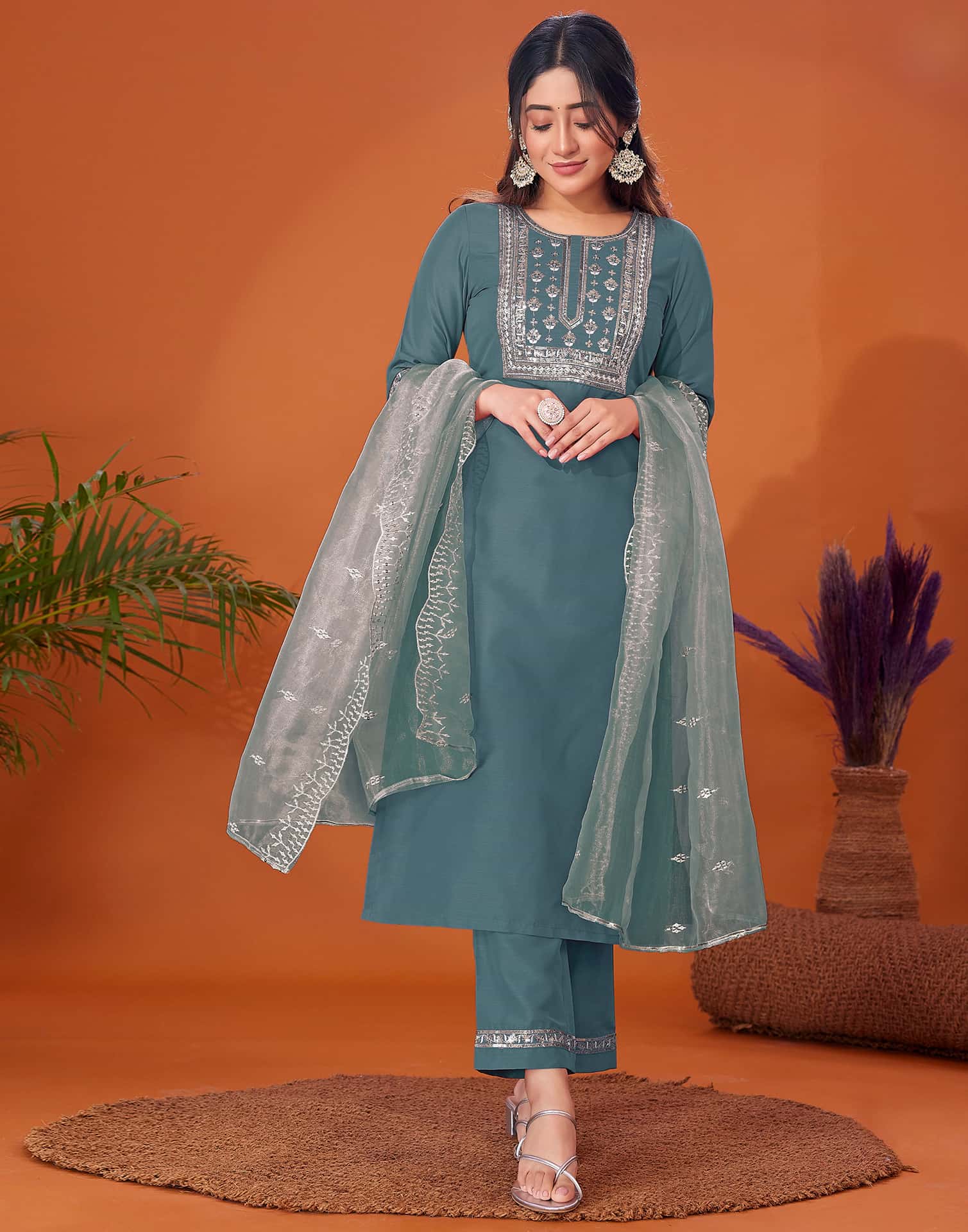 Experience the beauty of tradition with this Green Cotton Blend kurta set. Adorned with Embroidered and styled with a Round Neck, the kurta exudes sophistication. Complemented with Pant and an elegant dupatta, this complete outfit is ideal for Festive Wear. Crafted in India with lightweight fabric, it ensures ease of movement and effortless elegance. Comfortable Wear, High-quality Fabric, Indian Wear.