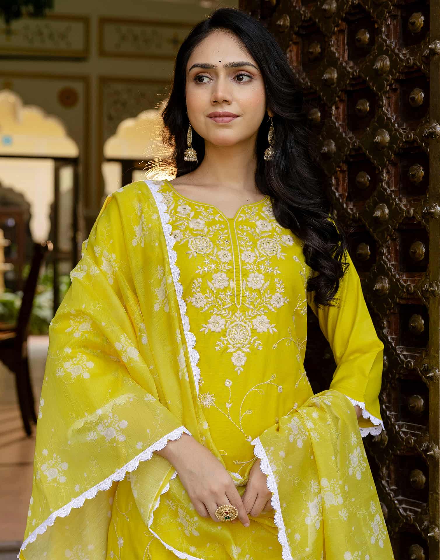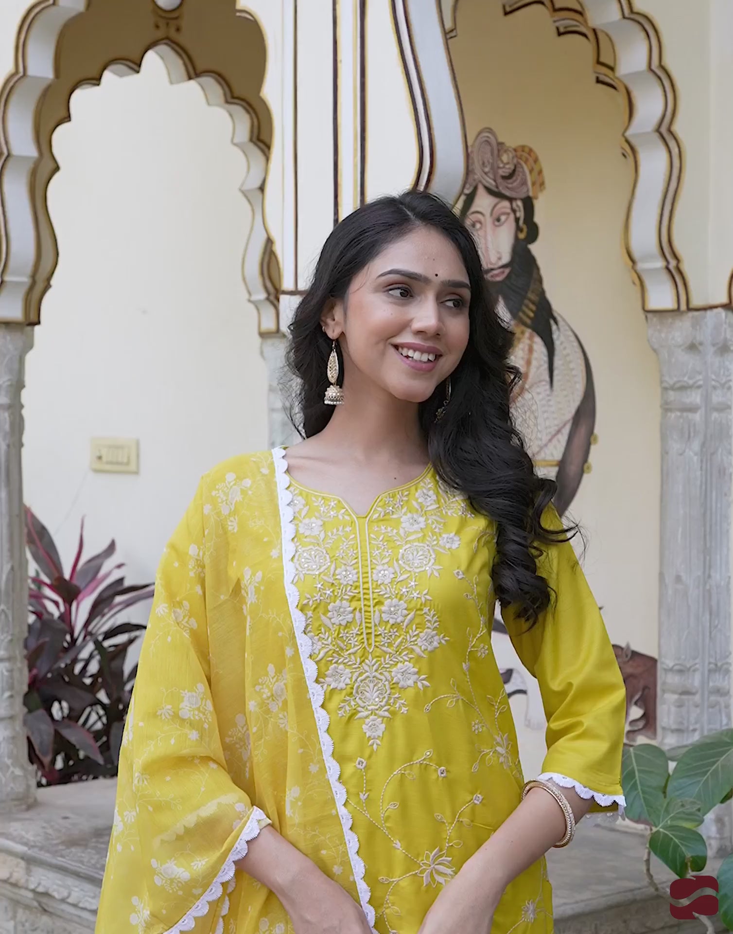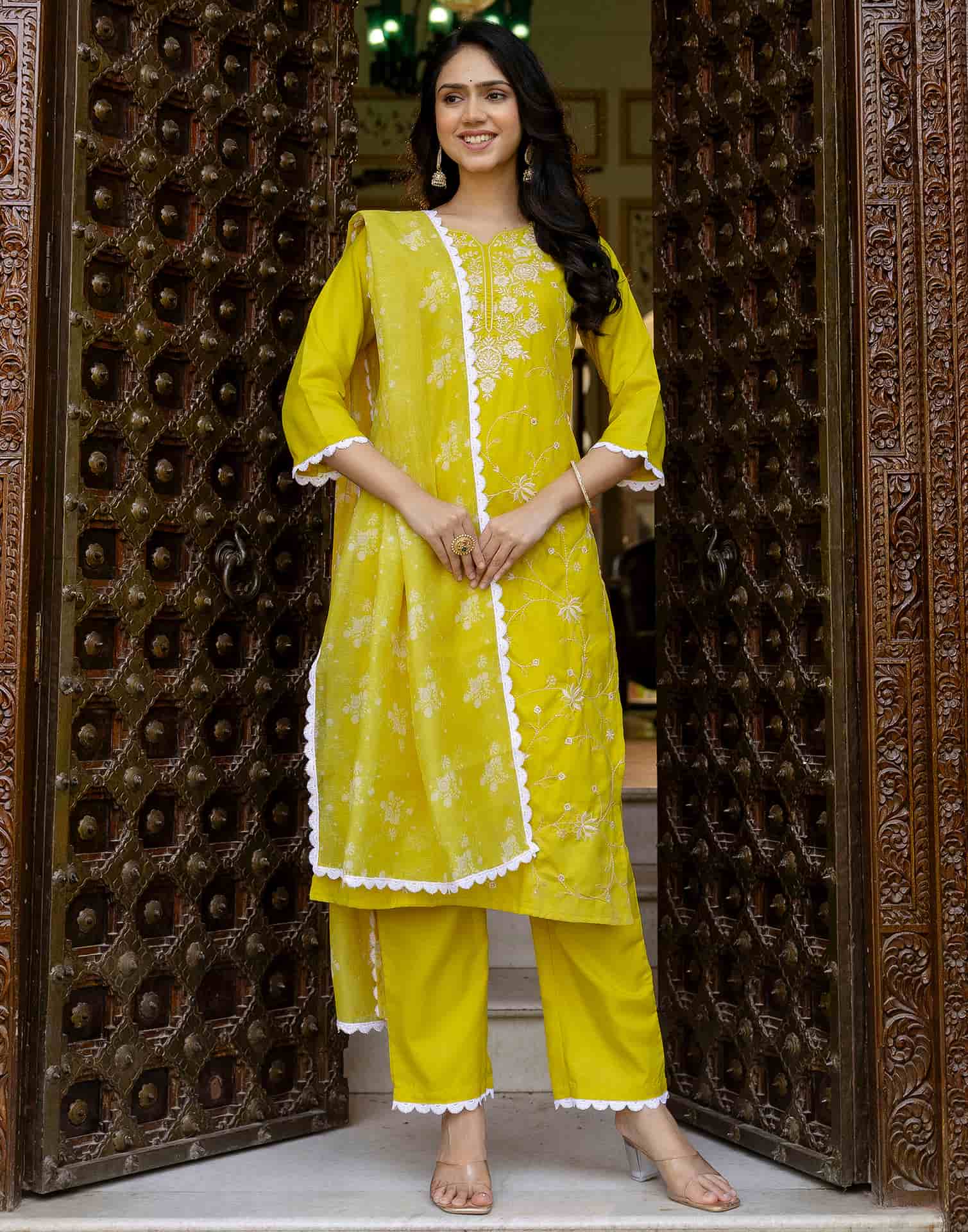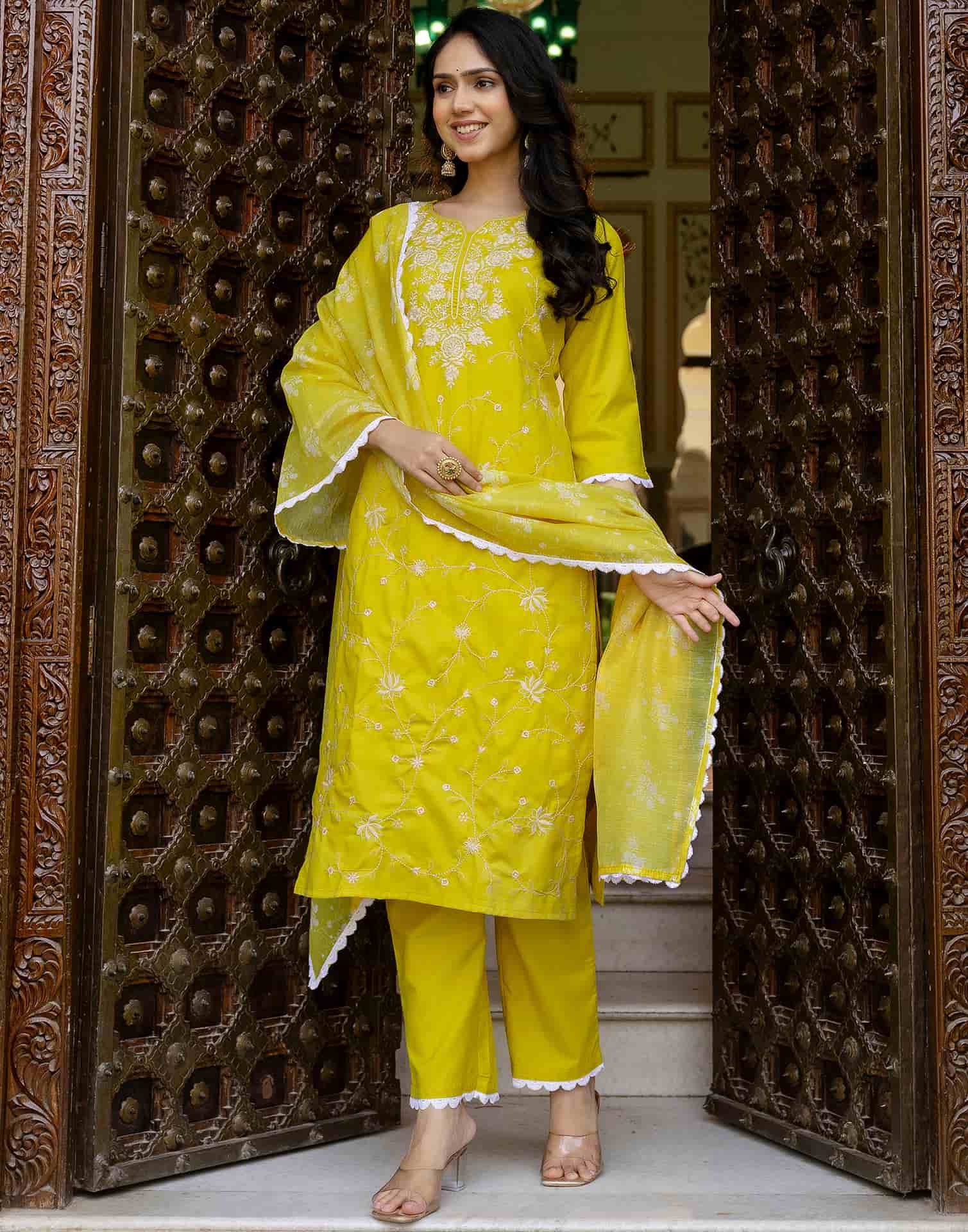 Step into sophistication with this Yellow Cotton Blend kurta set adorned with Embroidered. The kurta features a Round Neck for a refined look, paired with Pant and dupatta. Perfect for Festive Wear, it delivers comfortable wear, high-quality fabric, and effortless style. Soft & Breathable Fabric, Kurta with Pant & Dupatta, Semi-formal Wear.
