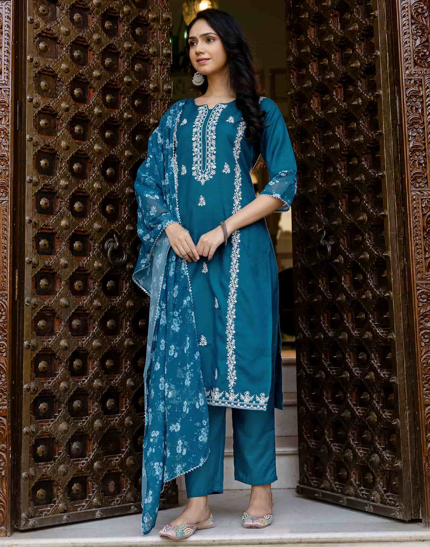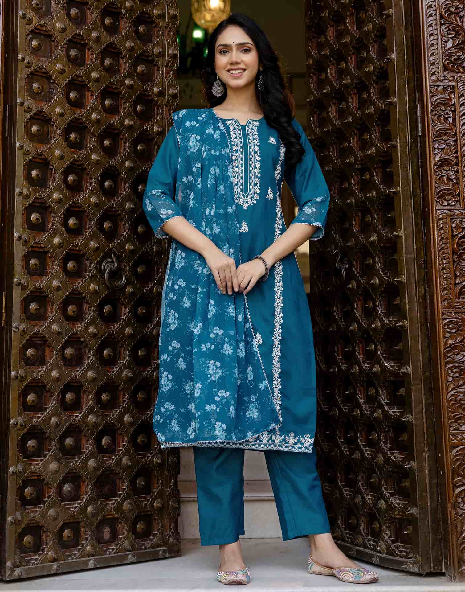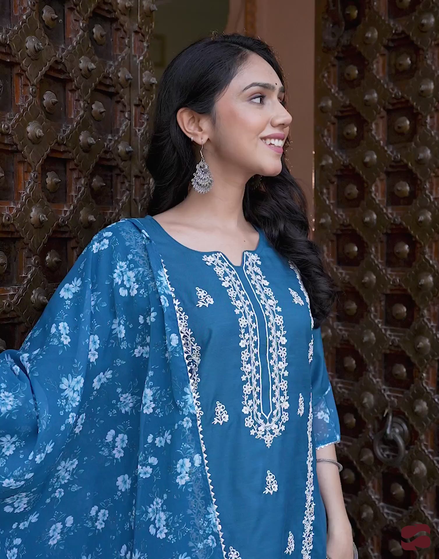 Crafted in Cotton Blend with exquisite Embroidered, this Blue kurta set is an essential for your ethnic wardrobe. The kurta comes with a Keyhole Neck, paired with Pant and dupatta for a complete look. Ideal for Festive Wear, it ensures ease of movement and premium fabric. A perfect choice for festive wear and traditional outfit lovers. Lightweight Fabric, Breathable Kurta, Premium Fabric.
