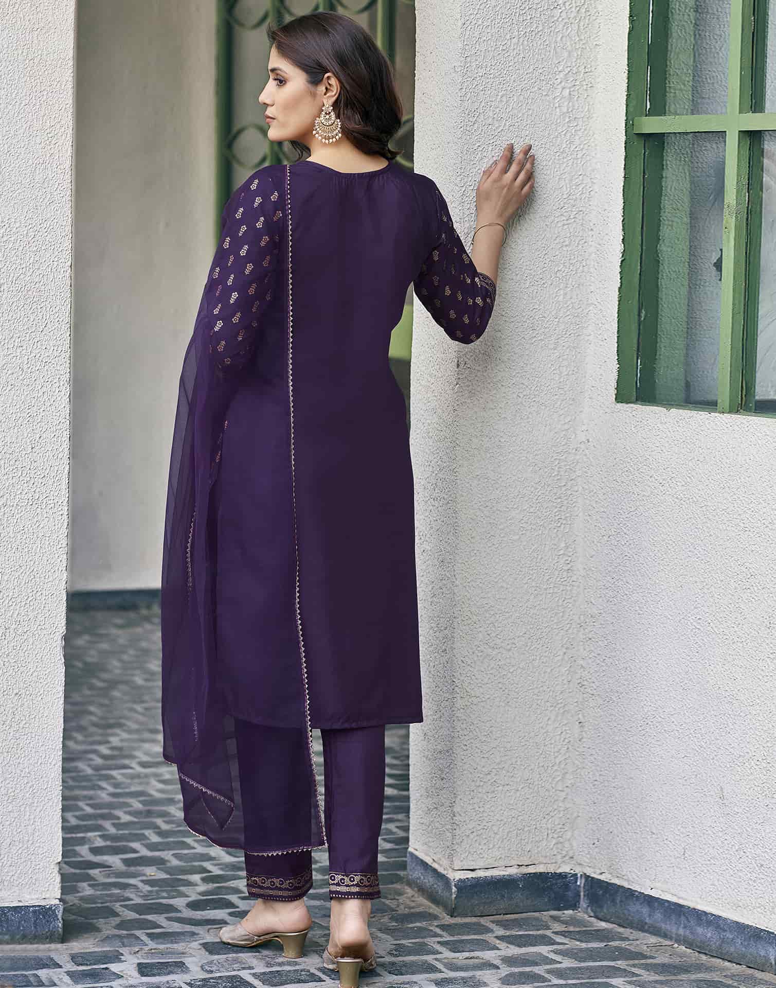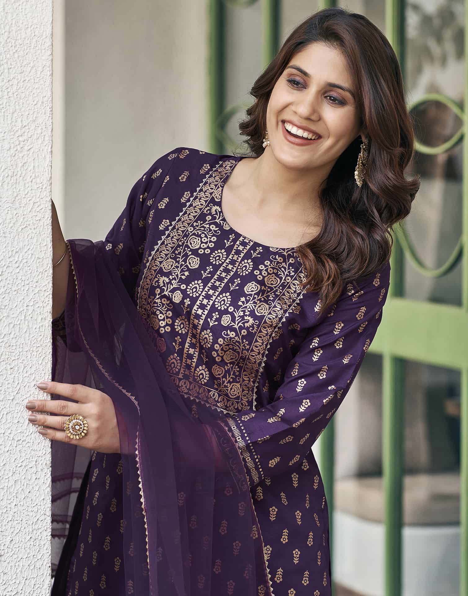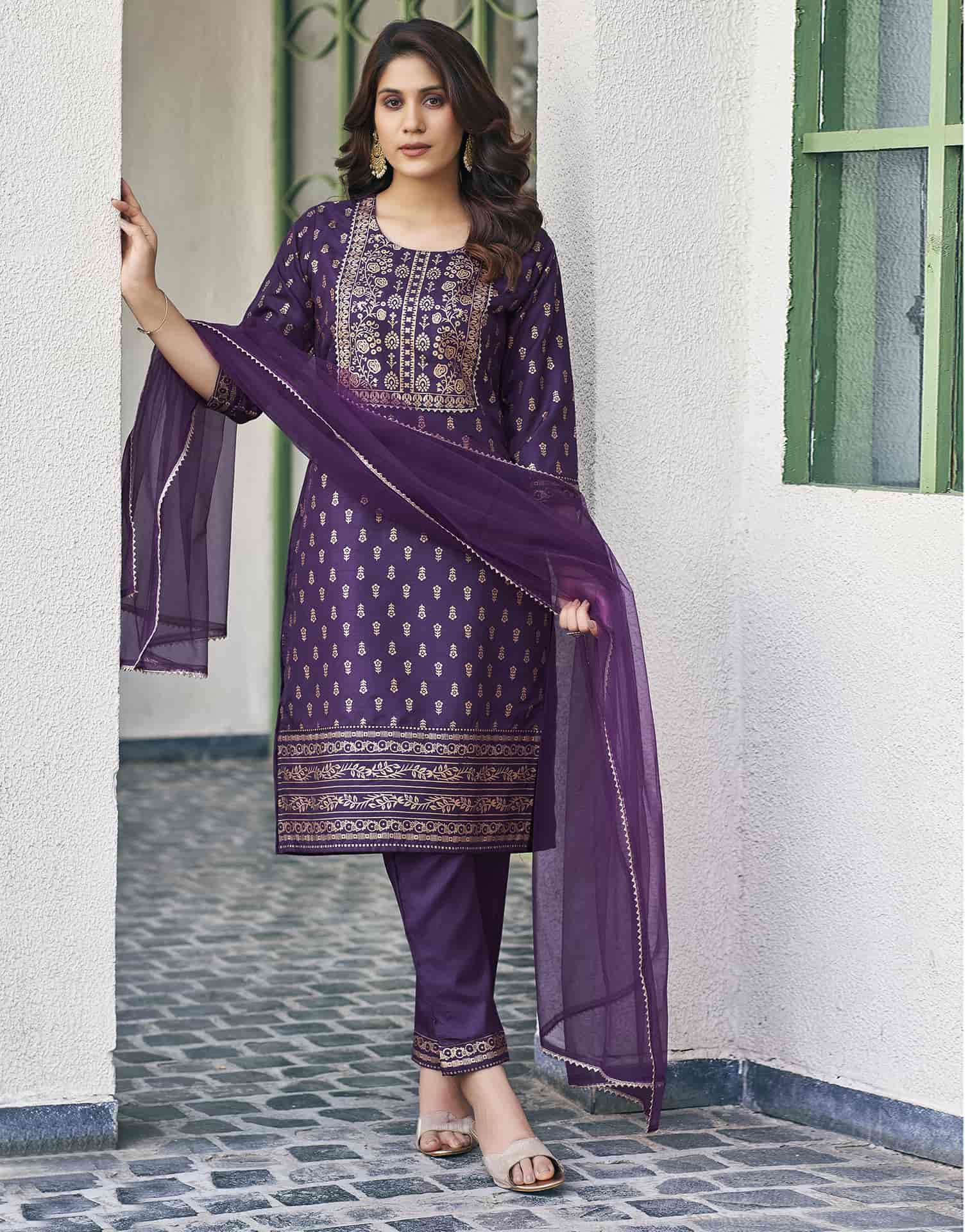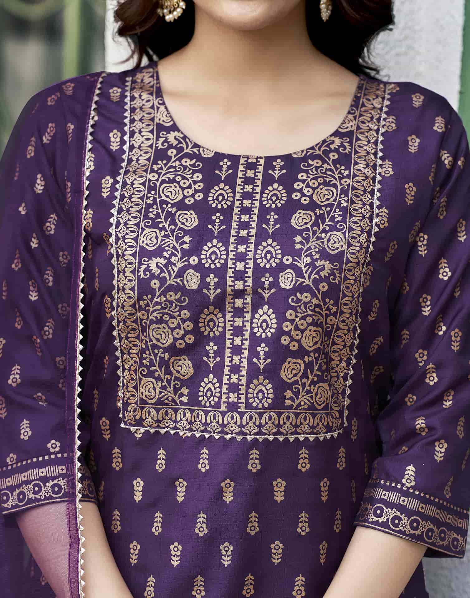 Refresh your ethnic collection with this Cotton Blend kurta set in Purple. Highlighted by Printed and styled with a Round Neck, the kurta blends comfort with tradition. Teamed with Pant and dupatta, this outfit is perfect for Everyday Wear. It guarantees comfortable wear, lightweight fabric, and the ease of an everyday ethnic wear. Family Function Wear, Soft & Breathable Fabric, Elegant Dupatta.