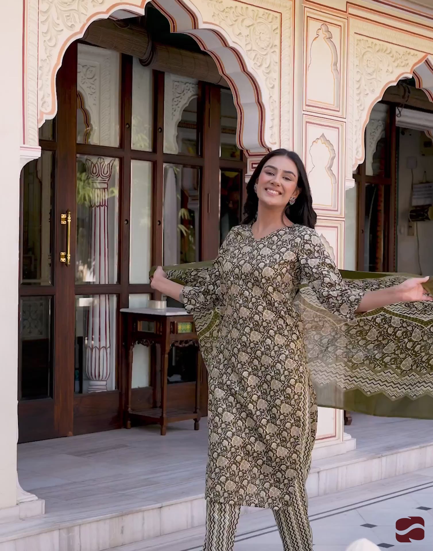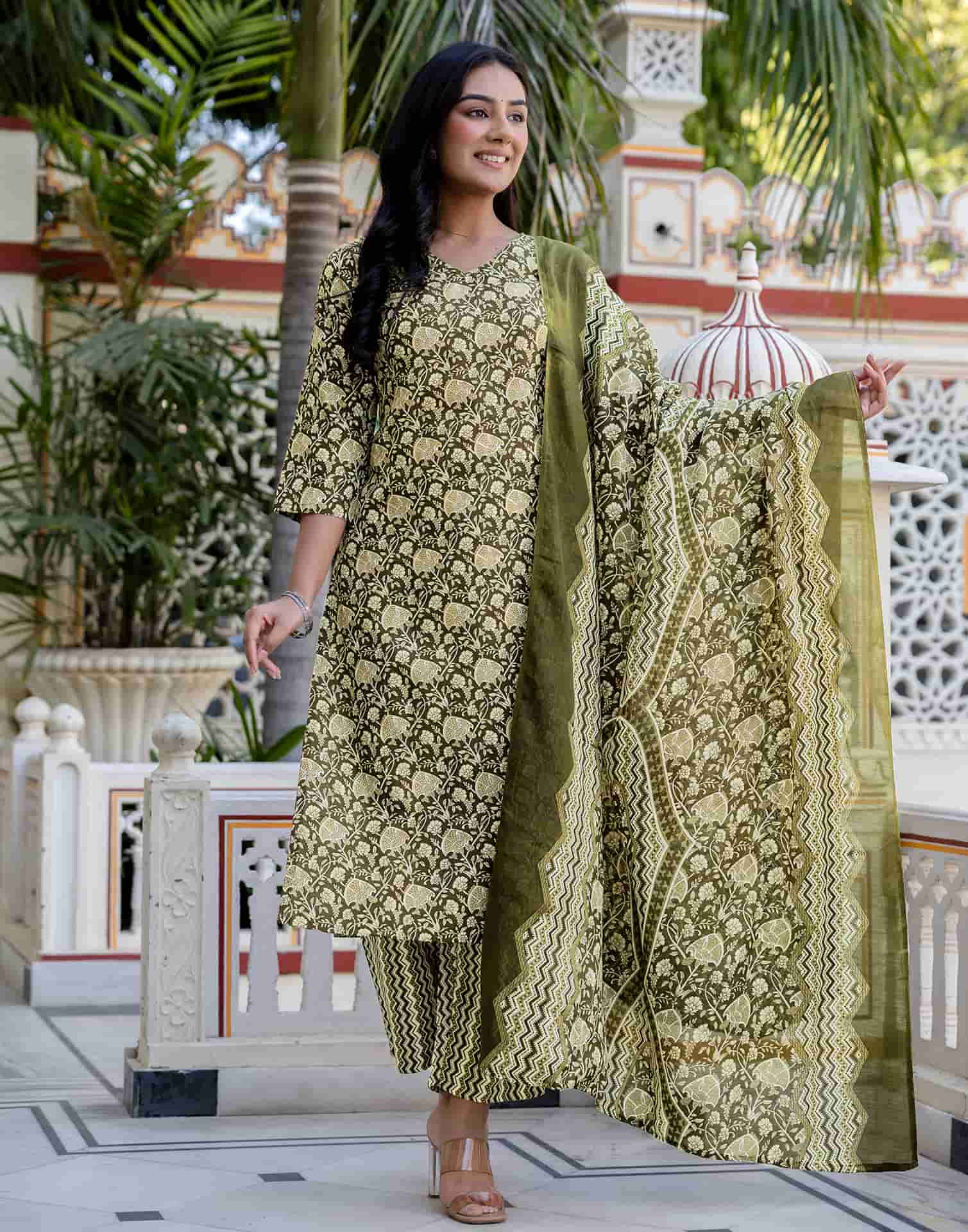 Bring elegance to every occasion with this Green Cotton Blend kurta set. Featuring Printed on the kurta and a V-Neck, it radiates traditional charm. Styled with Pant and dupatta, this outfit is ideal for Everyday Wear. Its high-quality fabric ensures breathability and all-day comfort, while the dupatta adds a touch of grace. Everyday Wear, Lightweight Fabric, All-day Comfort.