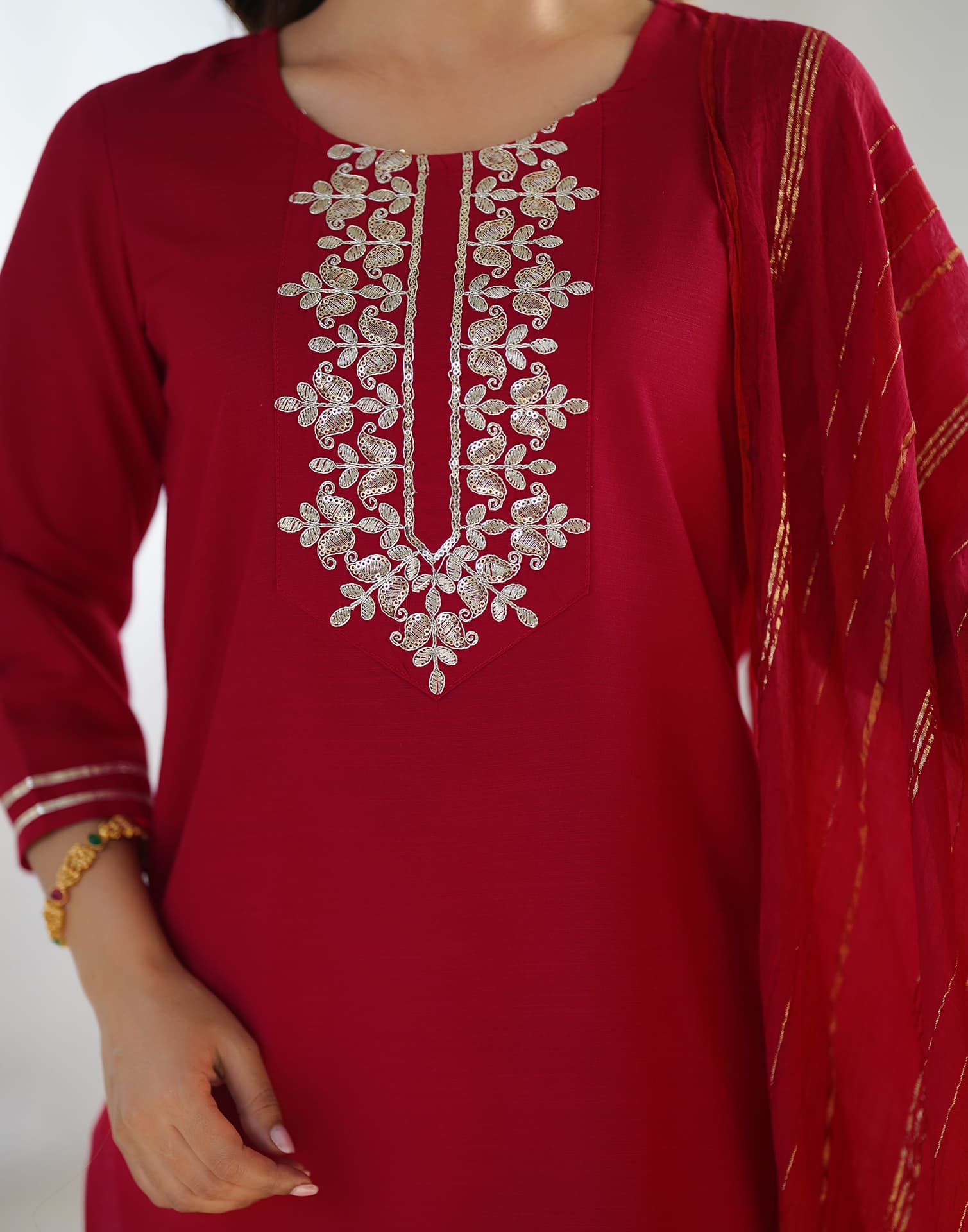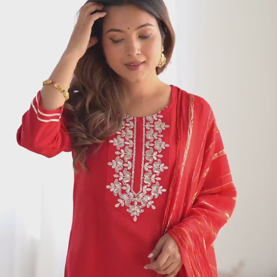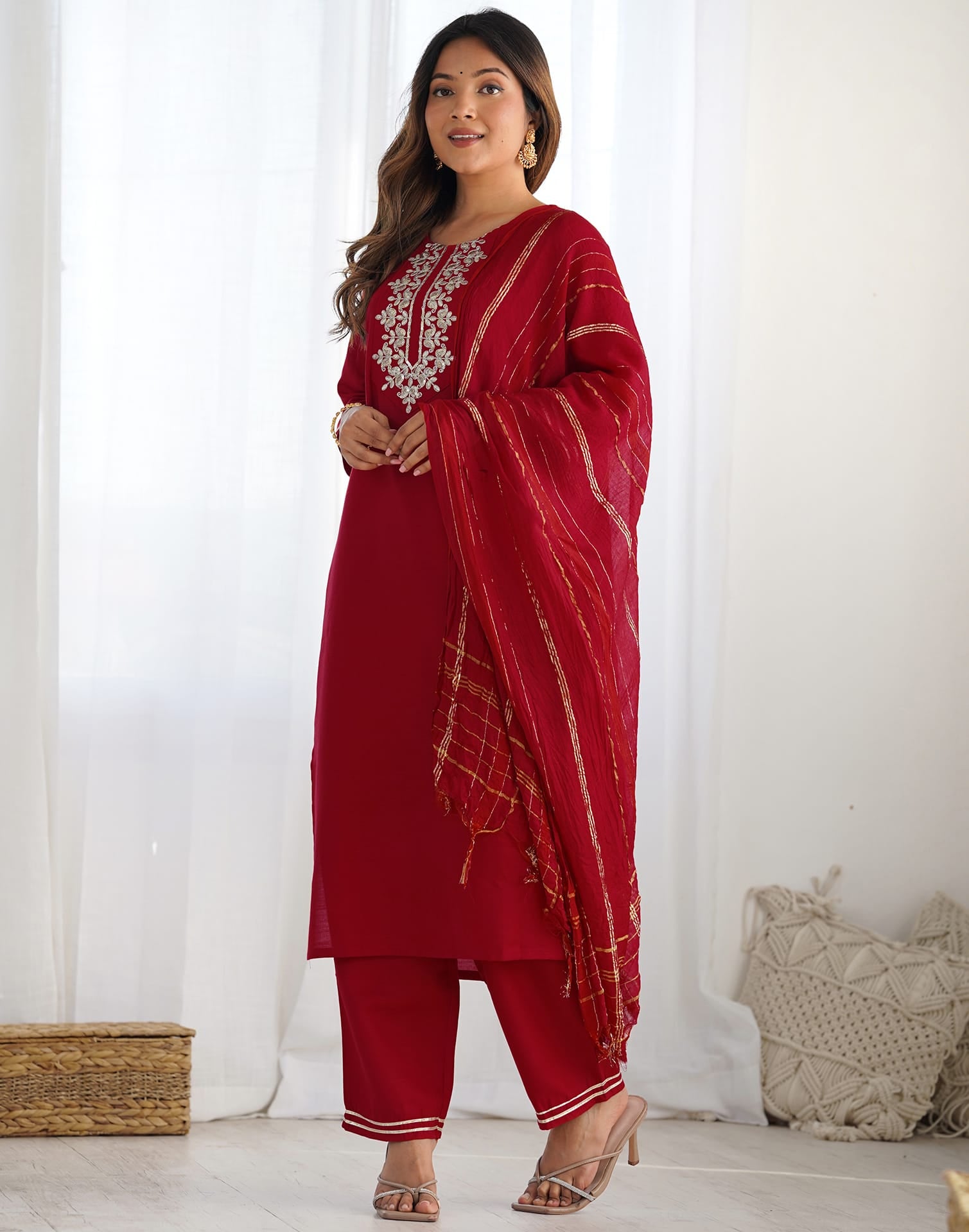 Crafted in Cotton Blend with exquisite Embroidered, this Red kurta set is an essential for your ethnic wardrobe. The kurta comes with a Round Neck, paired with Pant and dupatta for a complete look. Ideal for Festive Wear, it ensures comfortable wear and lightweight fabric. A perfect choice for festive wear and traditional outfit lovers. Graceful Silhouette, Indian Wear, Kurta with Pant & Dupatta.
