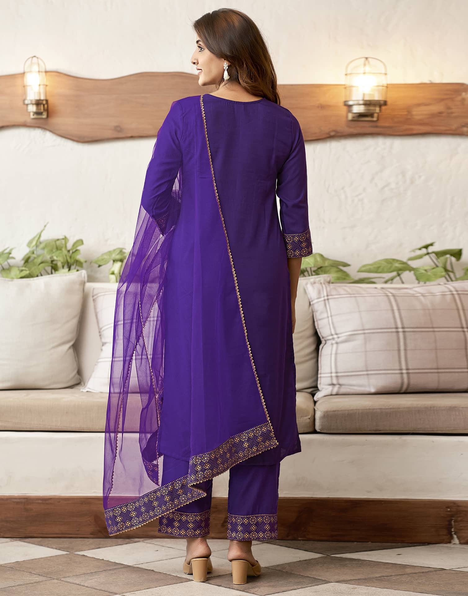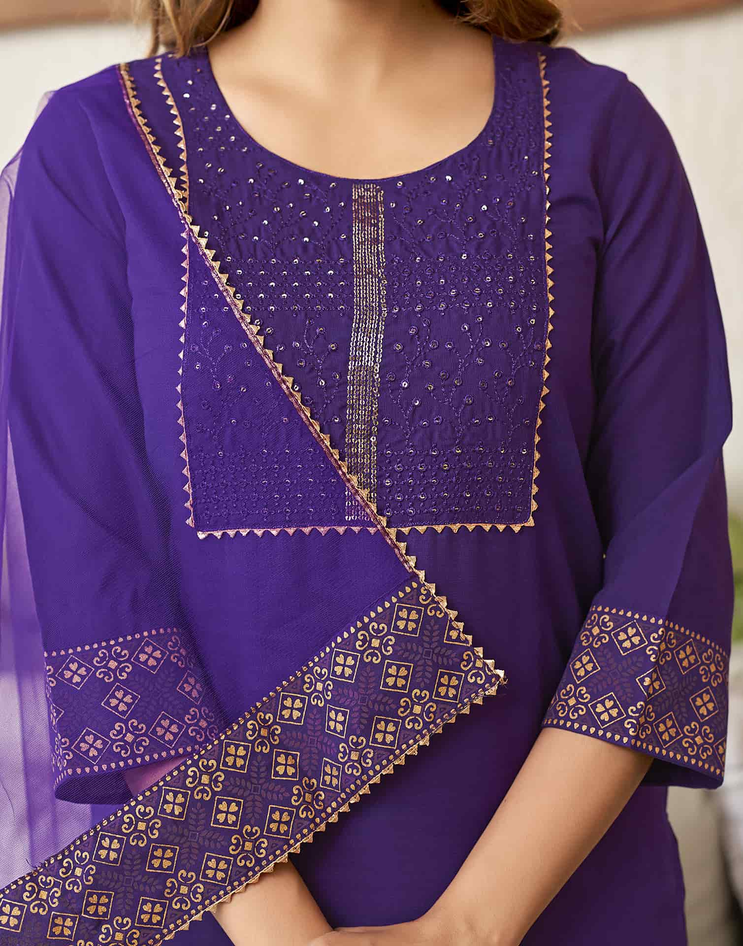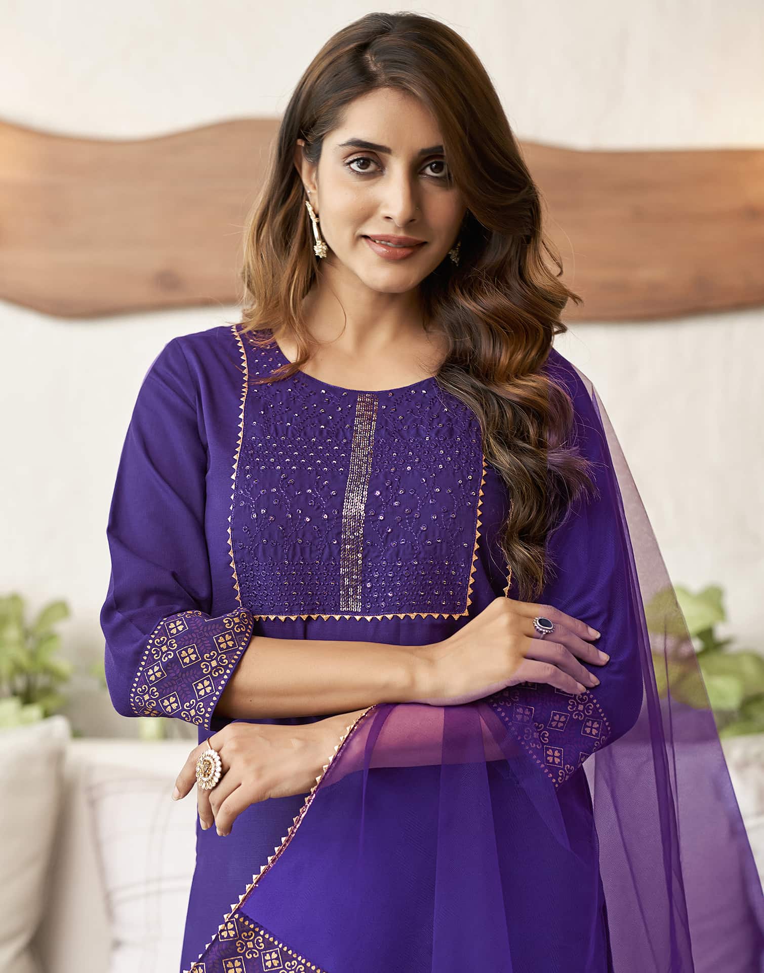 Elevate your ethnic wardrobe with this Cotton Blend kurta set in Purple. Designed with Embroidered and a Round Neck, the kurta offers a comfortable fit and stylish finish. The set includes Pant and a dupatta, completing the look. Suitable for Festive Wear, it combines high-quality fabric, comfortable wear, and modern design. Casual Wear, Traditional Occasion Outfit, Comfortable Wear.