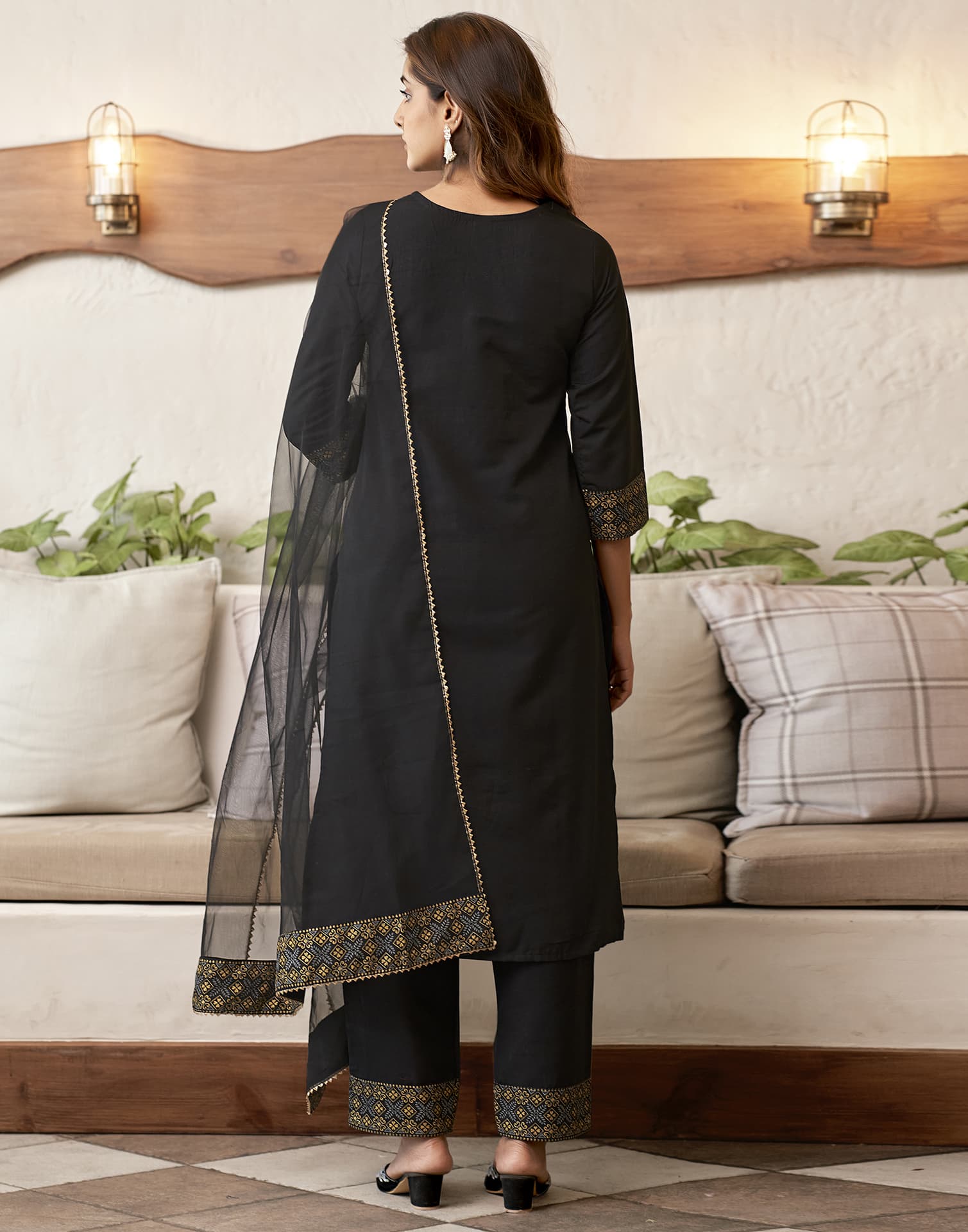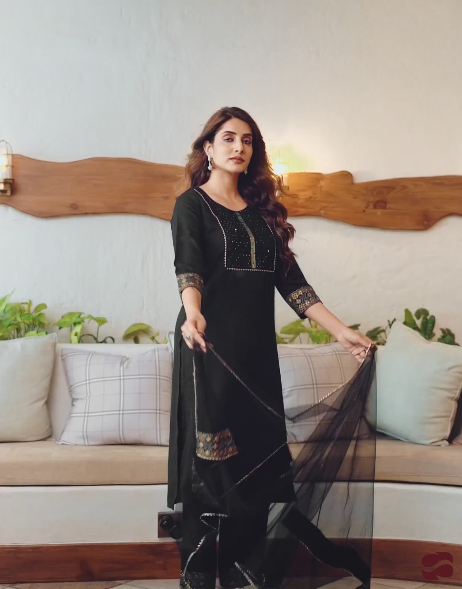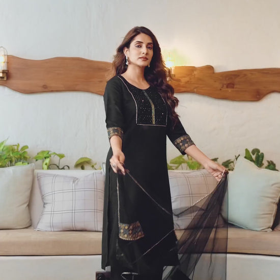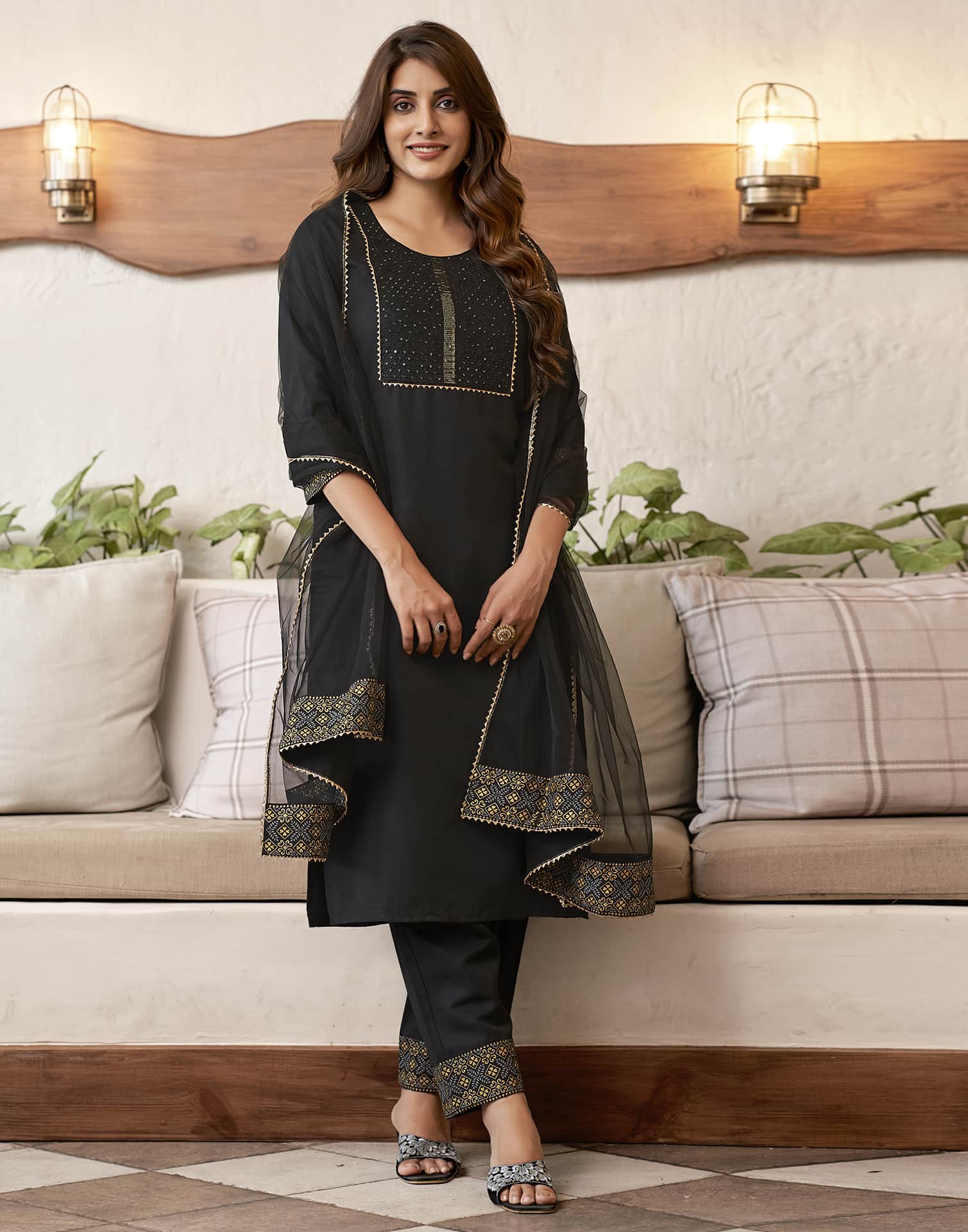 Elevate your ethnic wardrobe with this Cotton Blend kurta set in Black. Designed with Embroidered and a Round Neck, the kurta offers a comfortable fit and stylish finish. The set includes Pant and a dupatta, completing the look. Suitable for Festive Wear, it combines lightweight fabric, comfortable wear, and modern design. Lightweight Fabric, Family Function Wear, Complete Kurta Set.