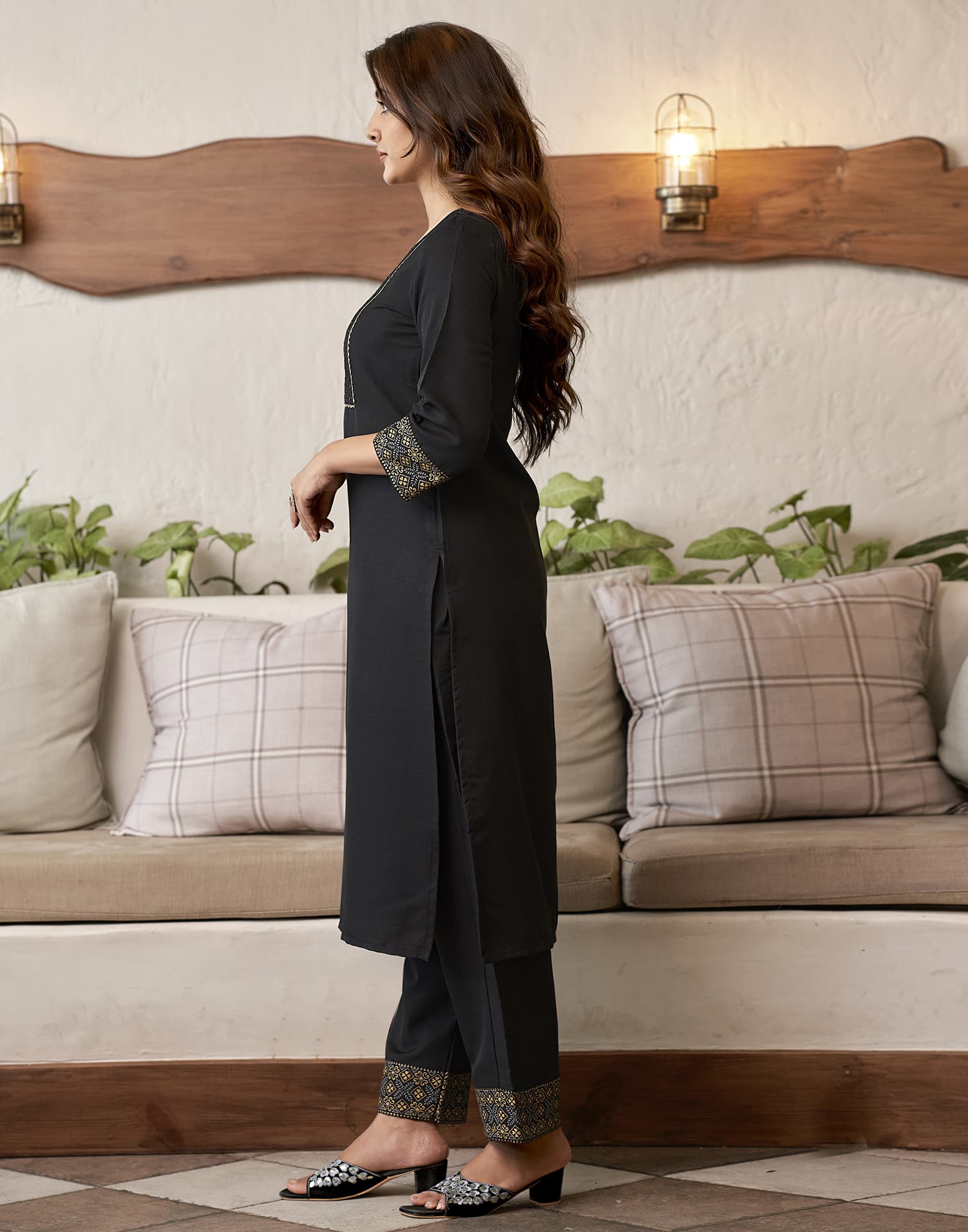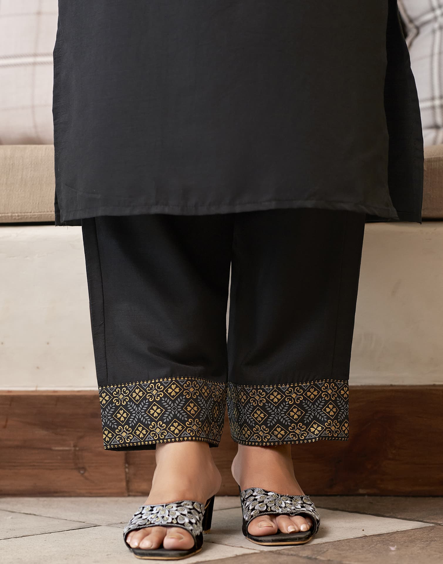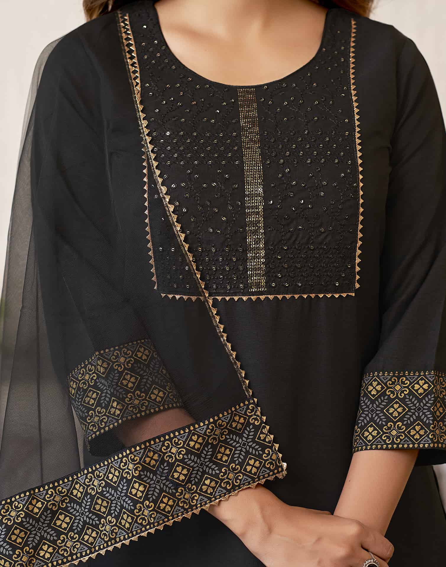 Elevate your ethnic wardrobe with this Cotton Blend kurta set in Black. Designed with Embroidered and a Round Neck, the kurta offers a comfortable fit and stylish finish. The set includes Pant and a dupatta, completing the look. Suitable for Festive Wear, it combines lightweight fabric, comfortable wear, and modern design. Lightweight Fabric, Family Function Wear, Complete Kurta Set.