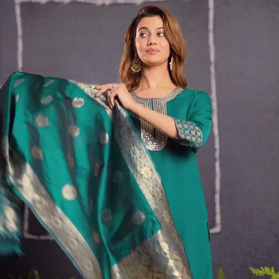 Crafted in Cotton Blend with exquisite Embroidered, this Green kurta set is an essential for your ethnic wardrobe. The kurta comes with a Round Neck, paired with Pant and dupatta for a complete look. Ideal for Festive Wear, it ensures ease of movement and soft & breathable fabric. A perfect choice for festive wear and traditional outfit lovers. Elegant Dupatta, All-day Comfort, Traditional Outfit.