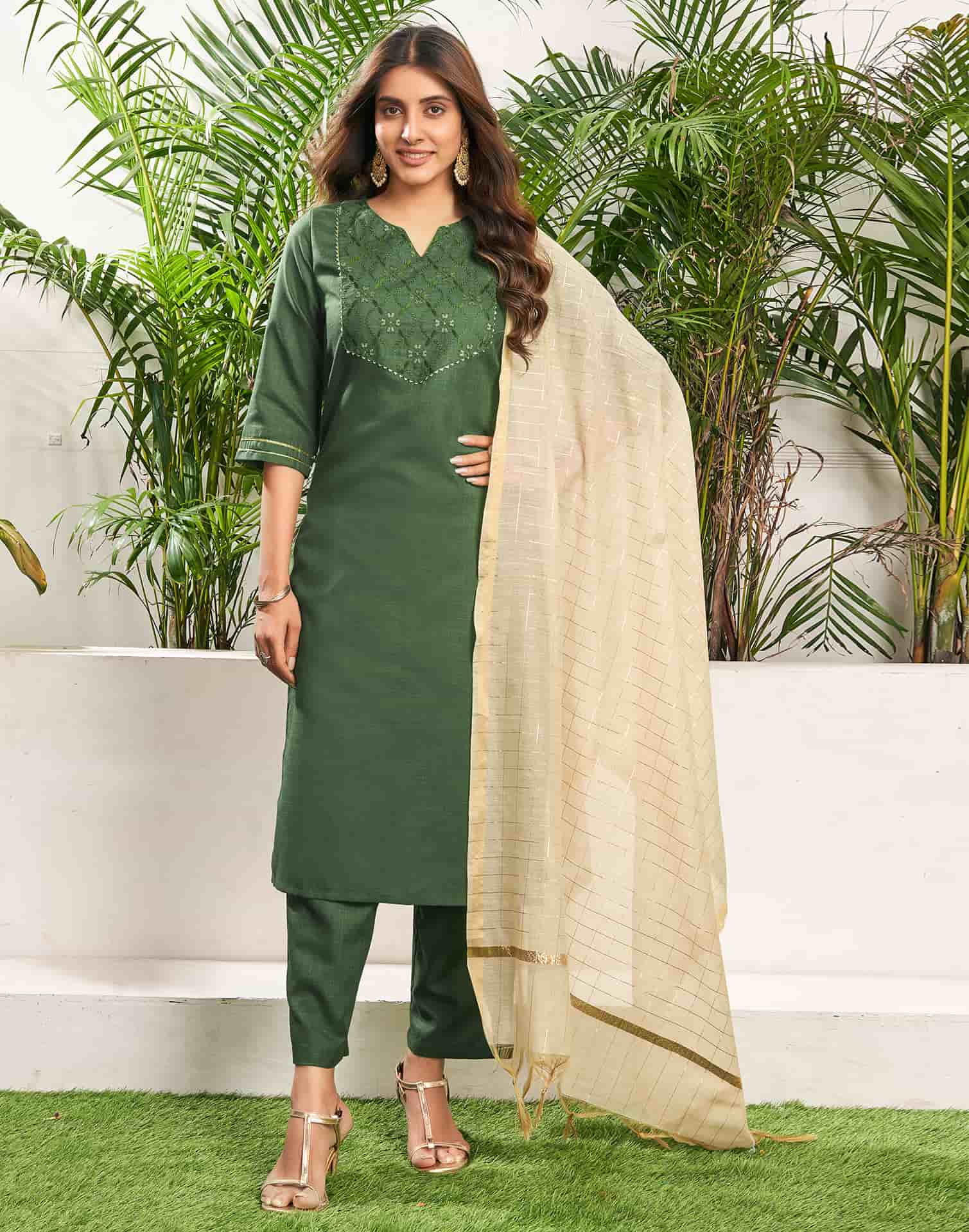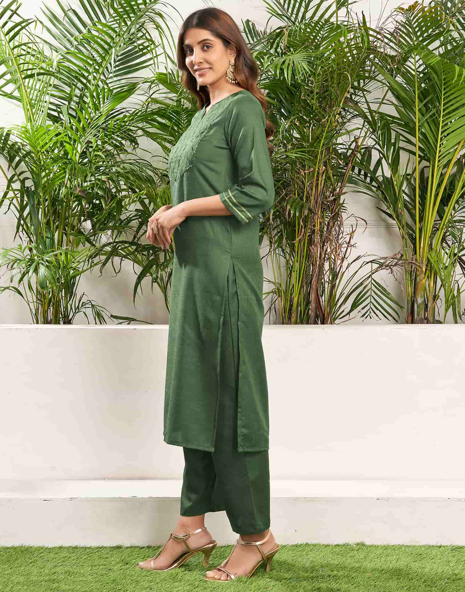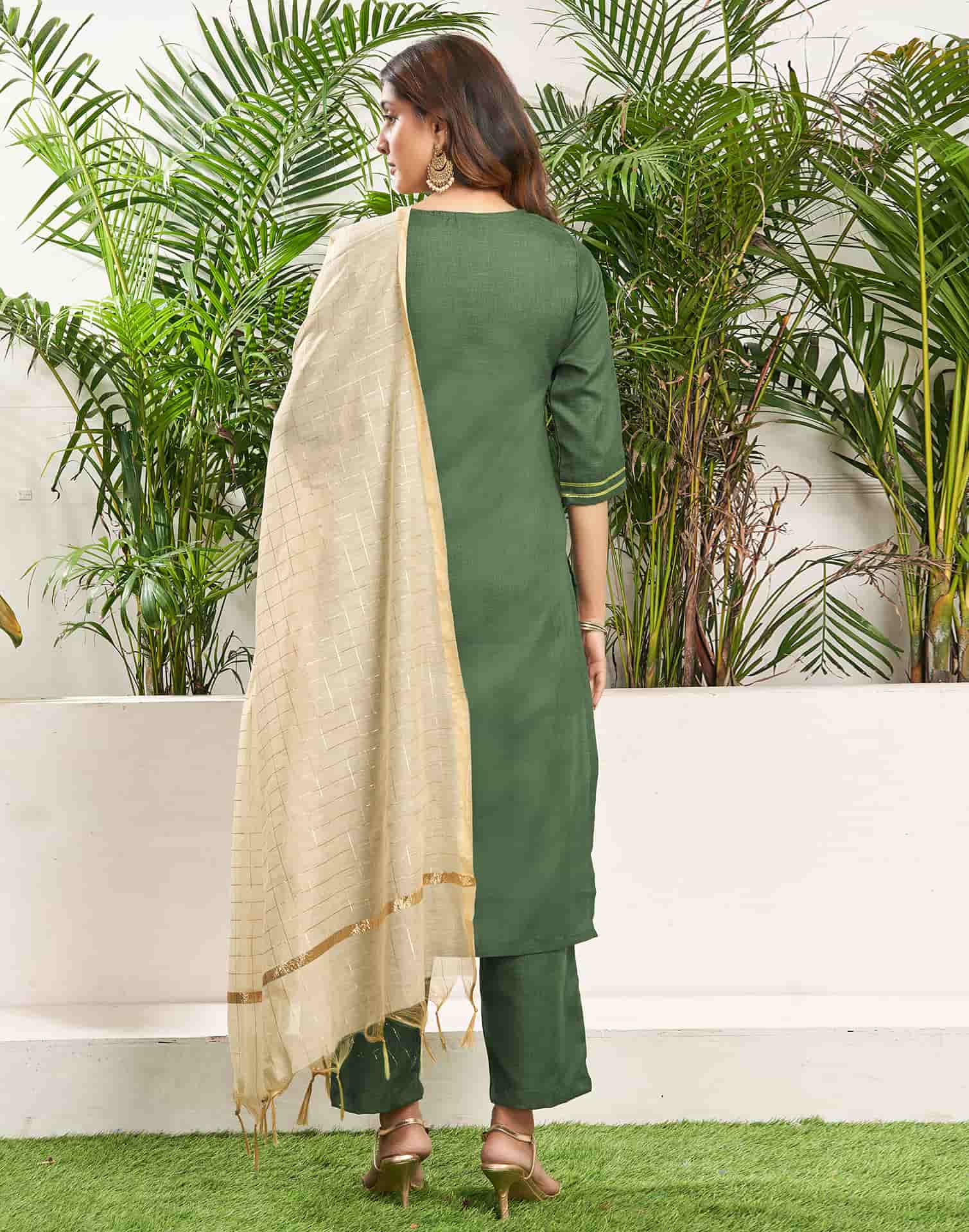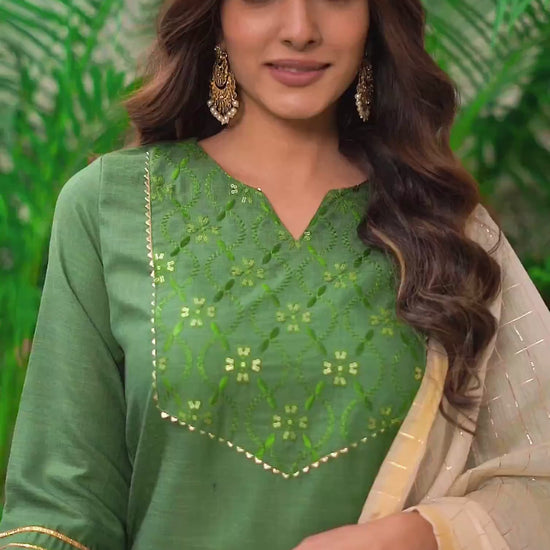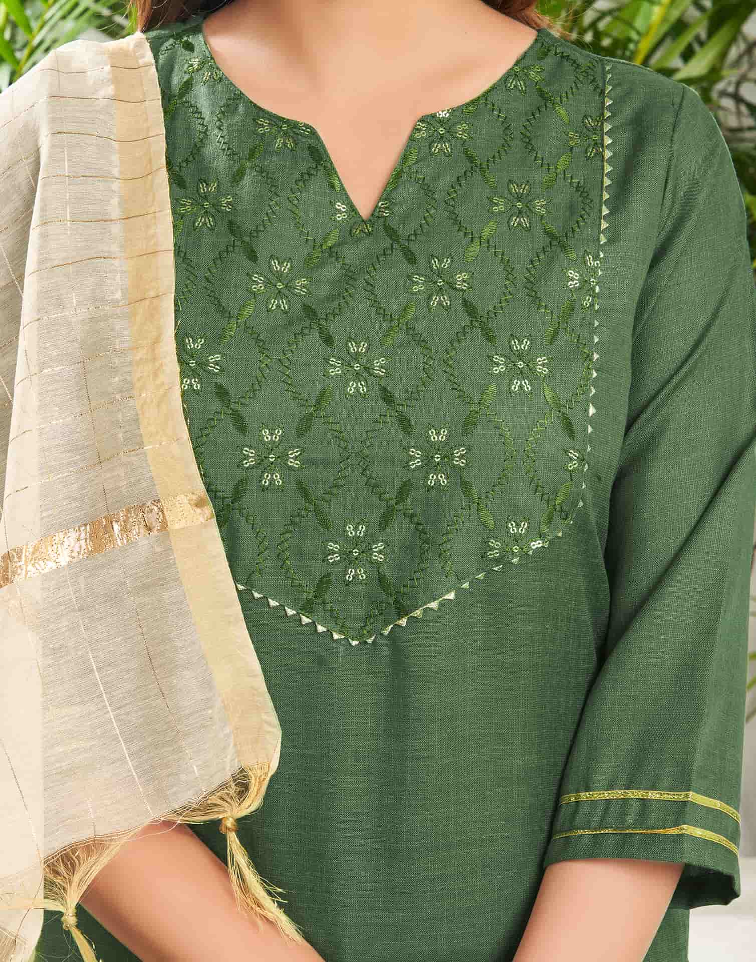 Step into sophistication with this Green Cotton Blend kurta set adorned with Embroidered. The kurta features a Keyhole Neck for a refined look, paired with Pant and dupatta. Perfect for Festive Wear, it delivers ease of movement, high-quality fabric, and effortless style. Semi-formal Wear, Easy to Maintain, Premium Fabric.