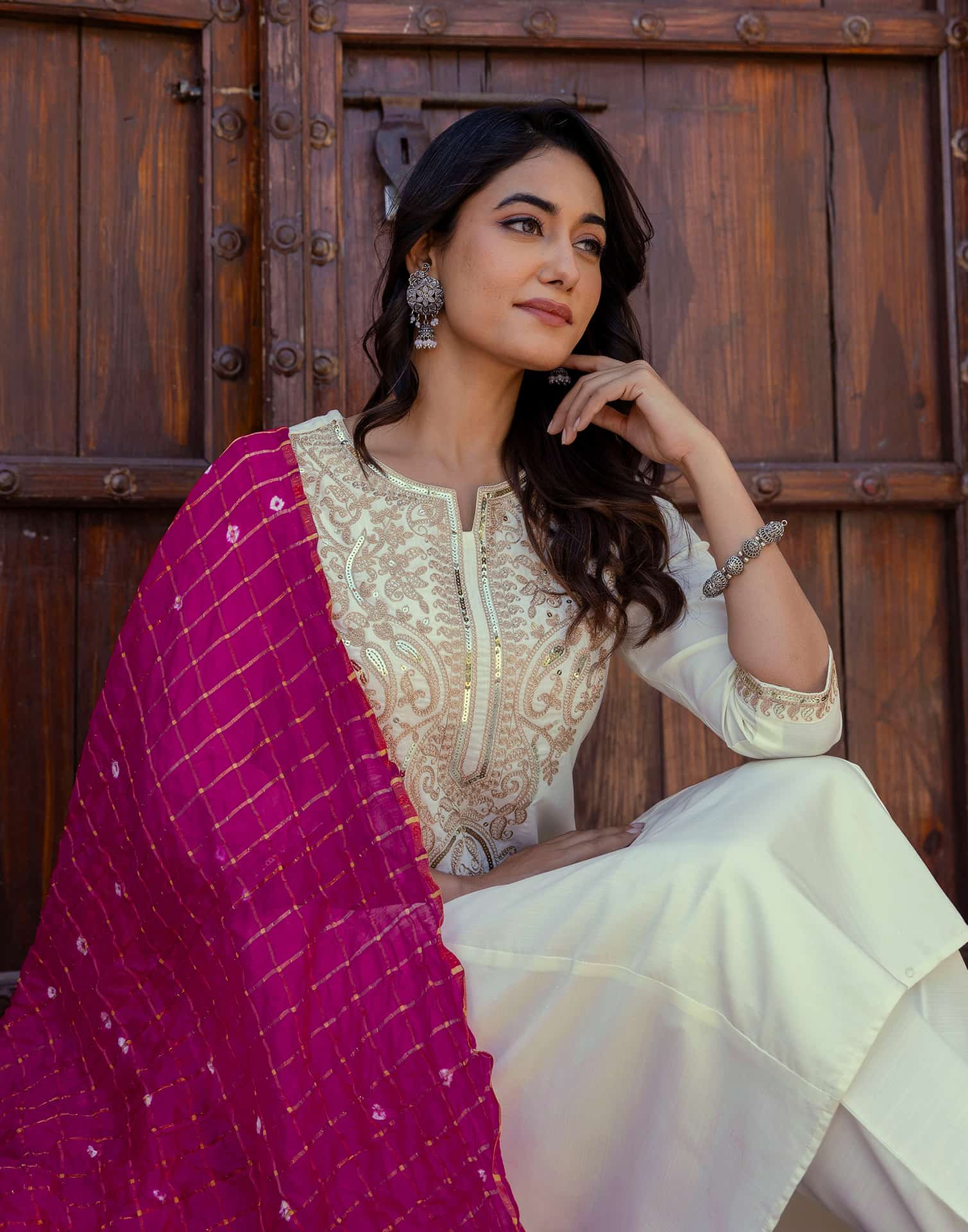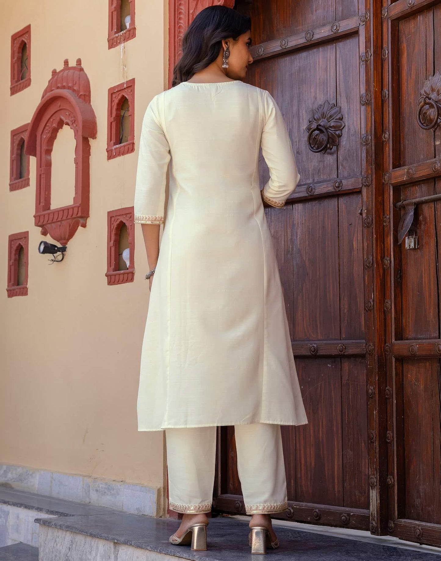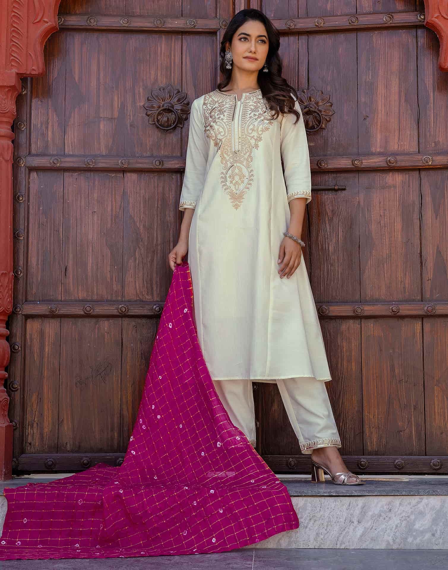 Step into sophistication with this Off White Cotton Blend kurta set adorned with Embroidered. The kurta features a Keyhole Neck for a refined look, paired with Pant and dupatta. Perfect for Festive Wear, it delivers comfortable wear, premium fabric, and effortless style. Complete Kurta Set, Comfortable Wear, Premium Fabric.