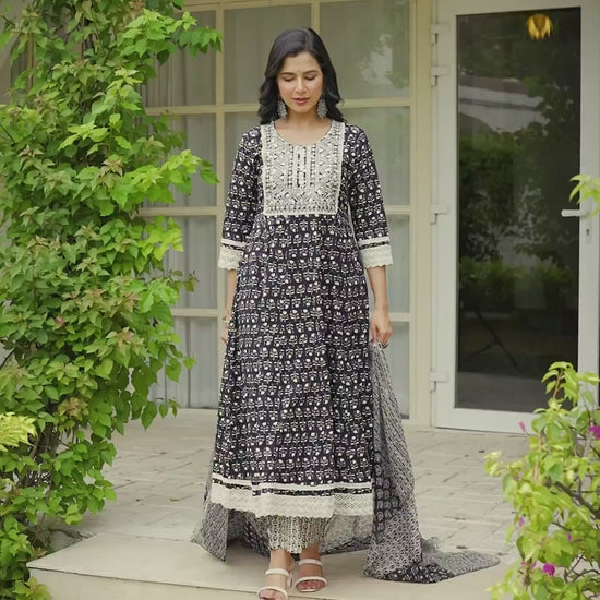 Elevate your ethnic wardrobe with this Cotton kurta set in Black. Designed with Embroidery And Sequins Work and a Round Neck, the kurta offers a comfortable fit and stylish finish. The set includes Pant and a dupatta, completing the look. Suitable for Family Function Wear, it combines high-quality fabric, all-day comfort, and modern design. Complete Kurta Set, Traditional Occasion Outfit, Matching Bottoms.