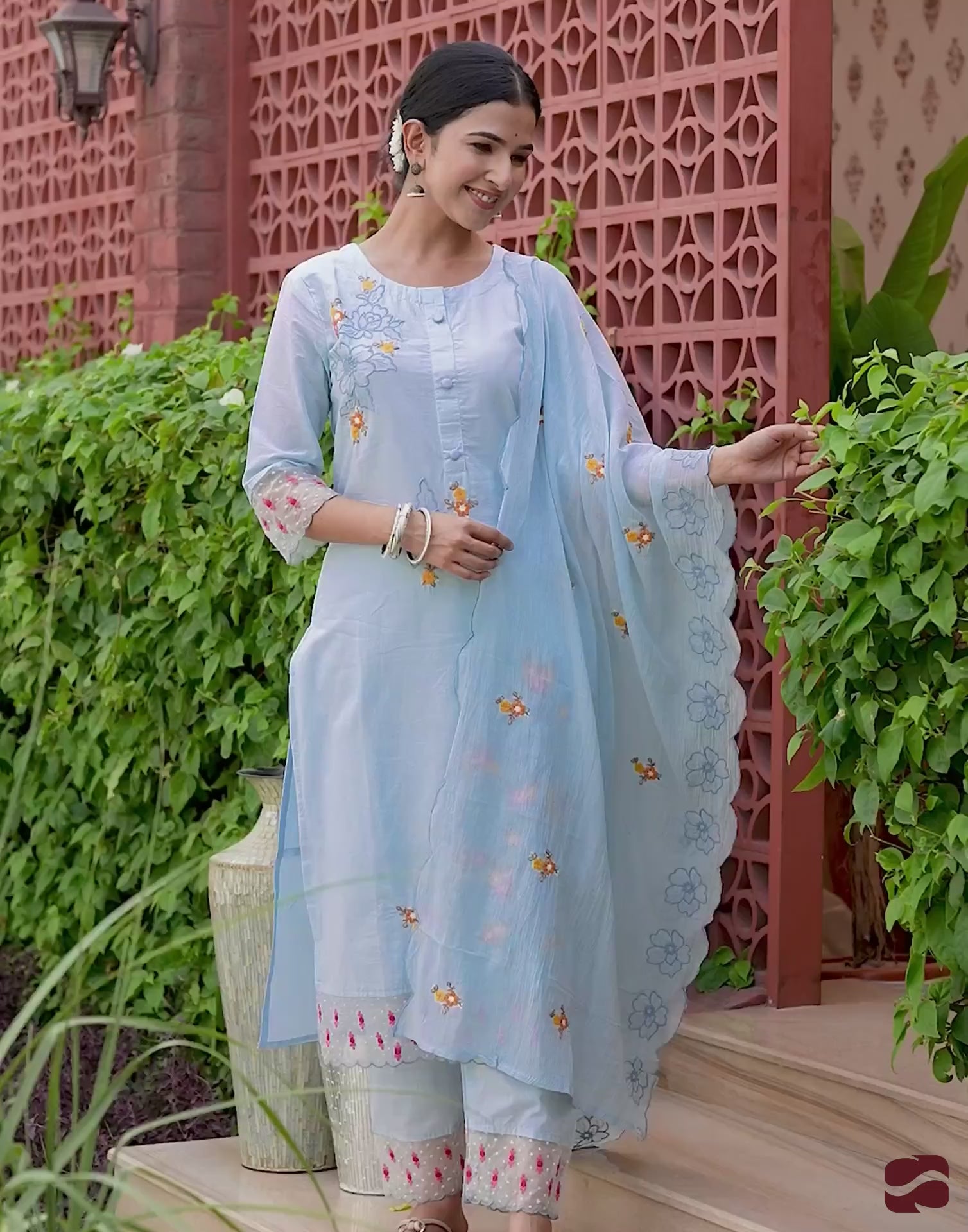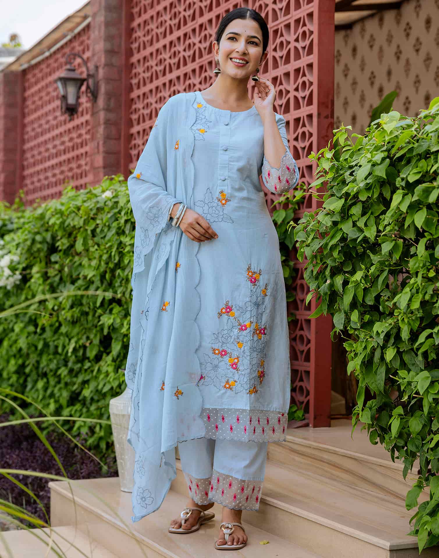 Bring elegance to every occasion with this Light Blue Cotton kurta set. Featuring Embroidery Work on the kurta and a Round Neck, it radiates traditional charm. Styled with Pant and dupatta, this outfit is ideal for Festive Wear. Its lightweight fabric ensures breathability and ease of movement, while the dupatta adds a touch of grace. Graceful Silhouette, Complete Kurta Set, Festive Wear.