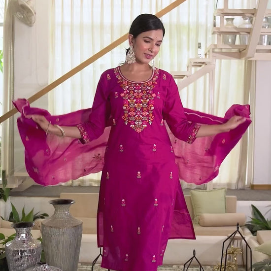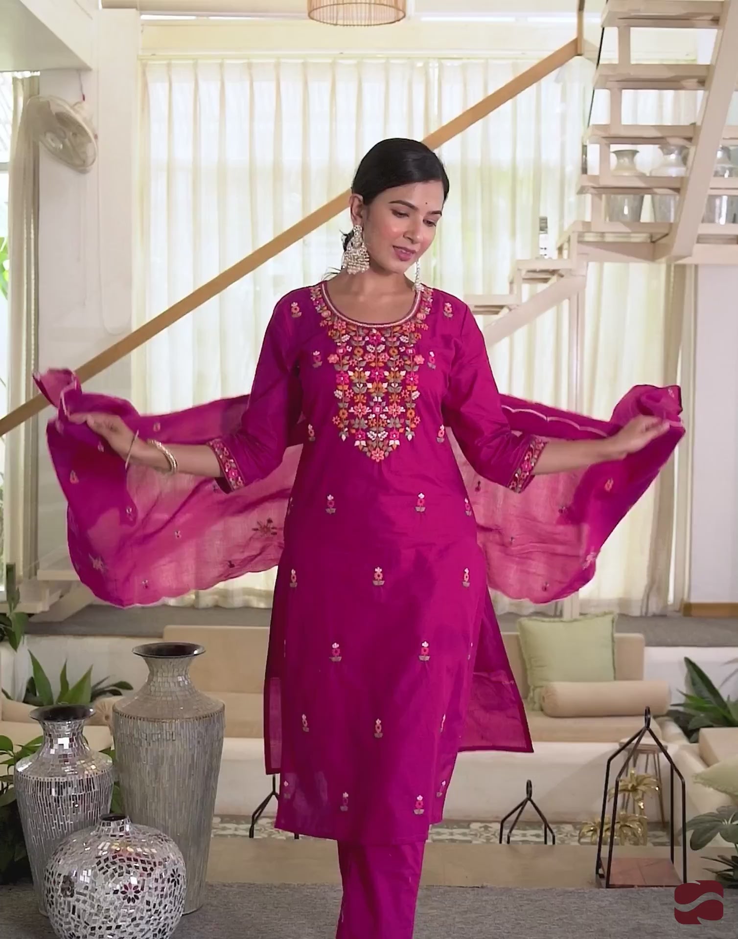 Cotton Embroidered Straight Kurta with Pant & Dupatta