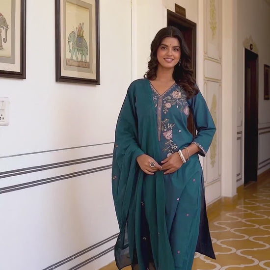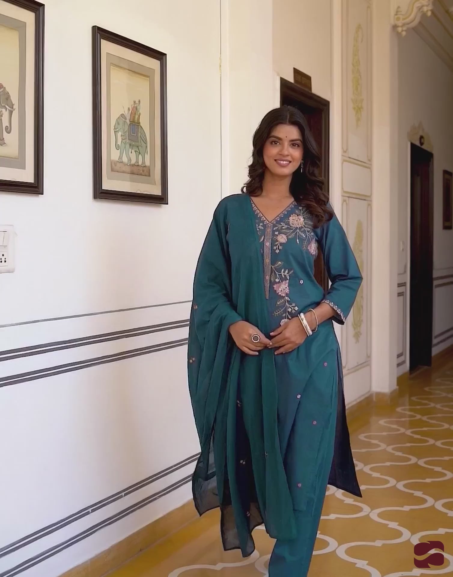Refresh your ethnic collection with this Cotton kurta set in Blue. Highlighted by Embroidery And Sequins Work and styled with a V-Neck, the kurta blends comfort with tradition. Teamed with Pant and dupatta, this outfit is perfect for Family Function Wear. It guarantees comfortable wear, premium fabric, and the ease of an everyday ethnic wear. Traditional Outfit, Lightweight Fabric, Semi-formal Wear.