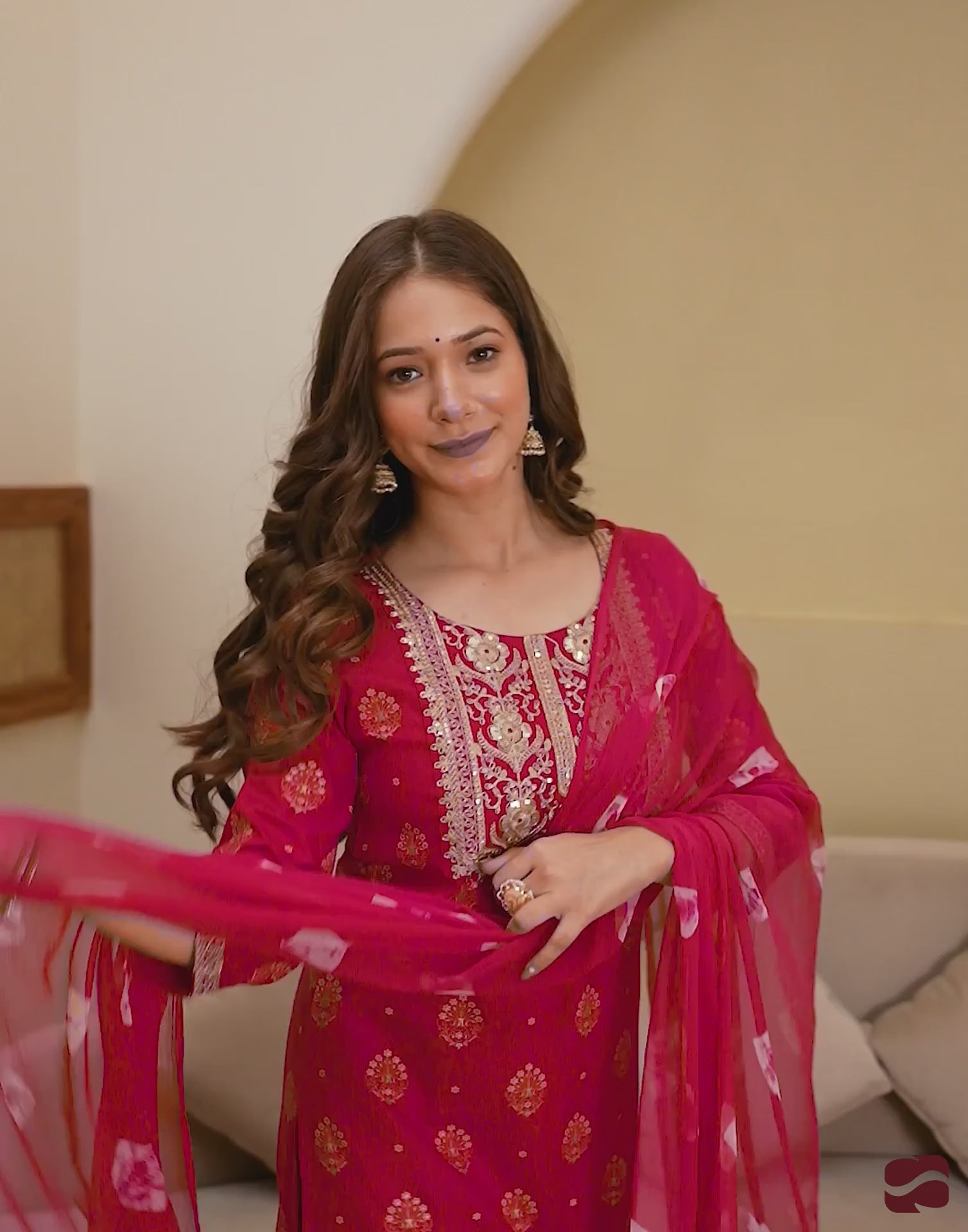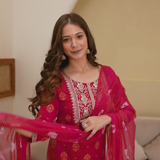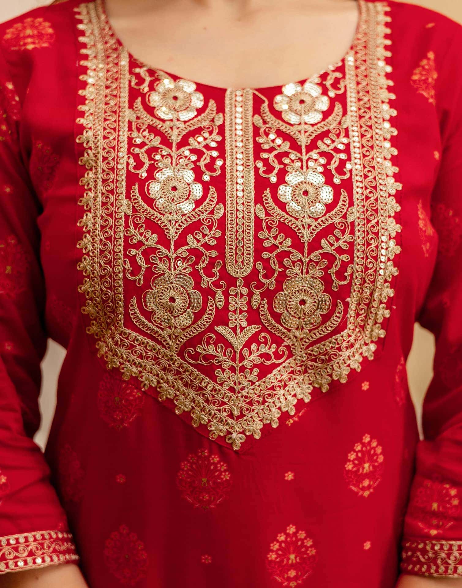 This Red Cotton kurta set is beautifully designed with Embroidery And Sequins Work. The kurta features a Round Neck and a graceful silhouette for an elegant appeal. It is paired with Pant With Pocket and a matching dupatta, making it a complete kurta set. Perfect for Family Function Wear, this ethnic wear for women offers lightweight fabric, comfortable wear, and timeless charm. Comfortable Wear, Festive Wear, Everyday Wear.