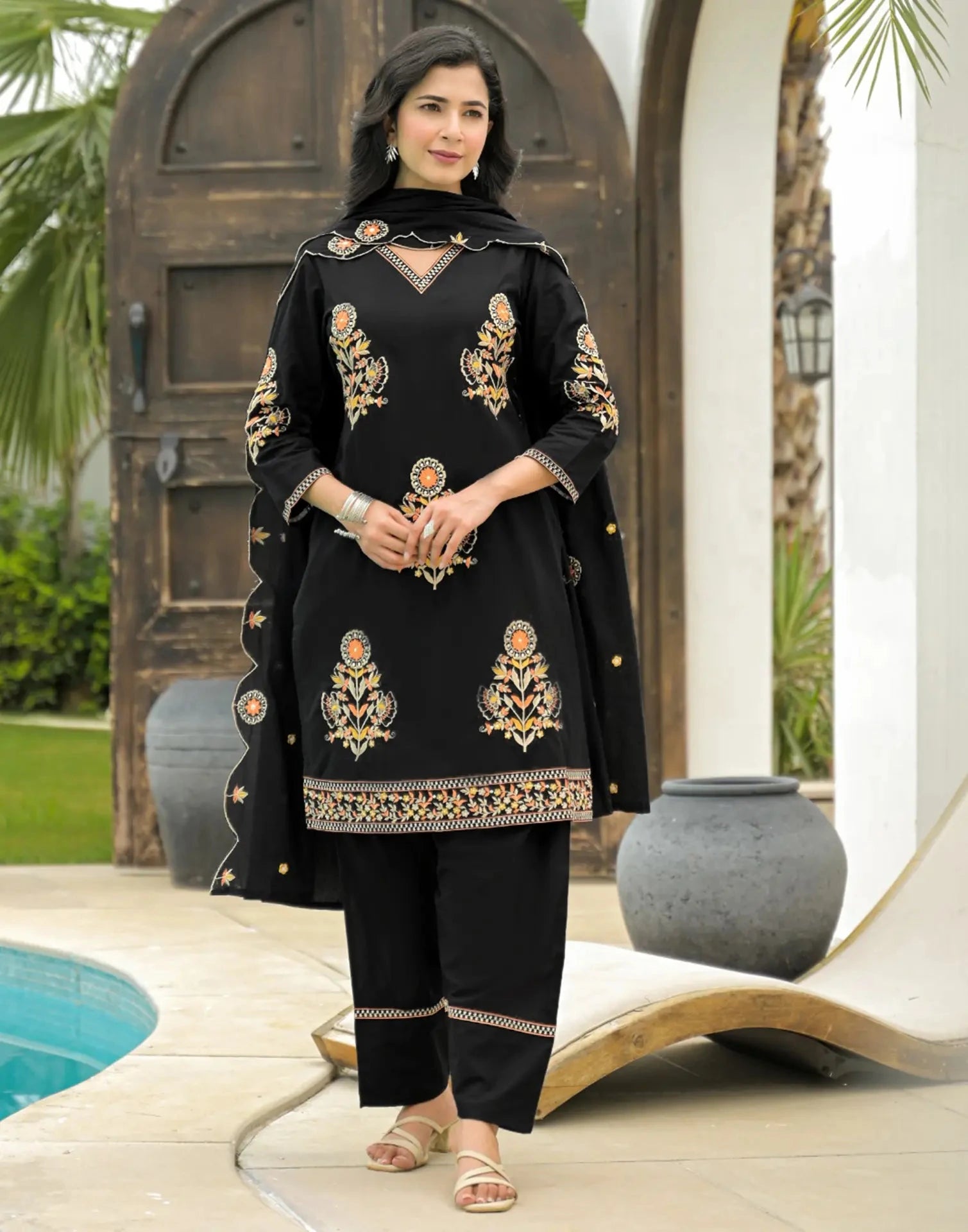 Cotton Embroidered V-Neck Straight Kurta with Pant & Dupatta