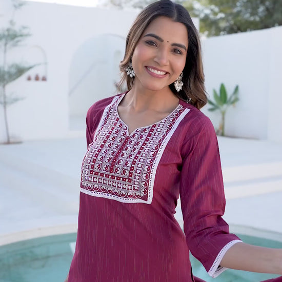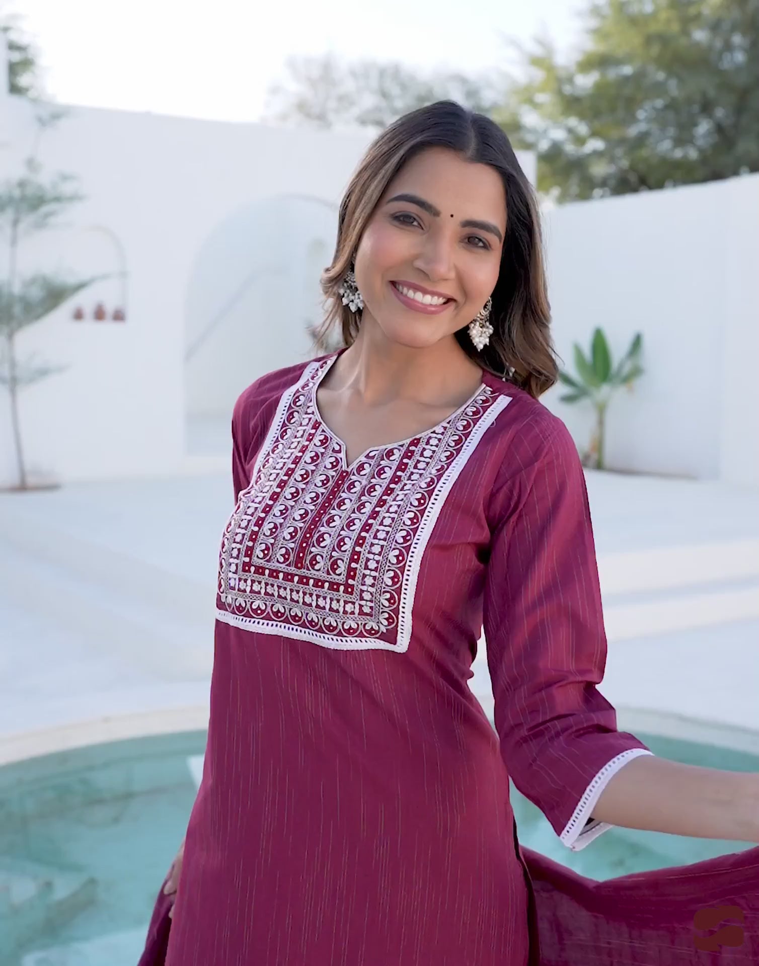 Crafted in Cotton with exquisite Embroidered, this Brown kurta set is an essential for your ethnic wardrobe. The kurta comes with a Keyhole Neck, paired with Pant and dupatta for a complete look. Ideal for Festive Wear, it ensures all-day comfort and lightweight fabric. A perfect choice for festive wear and traditional outfit lovers. Complete Kurta Set, Made in India, Comfortable Fit.